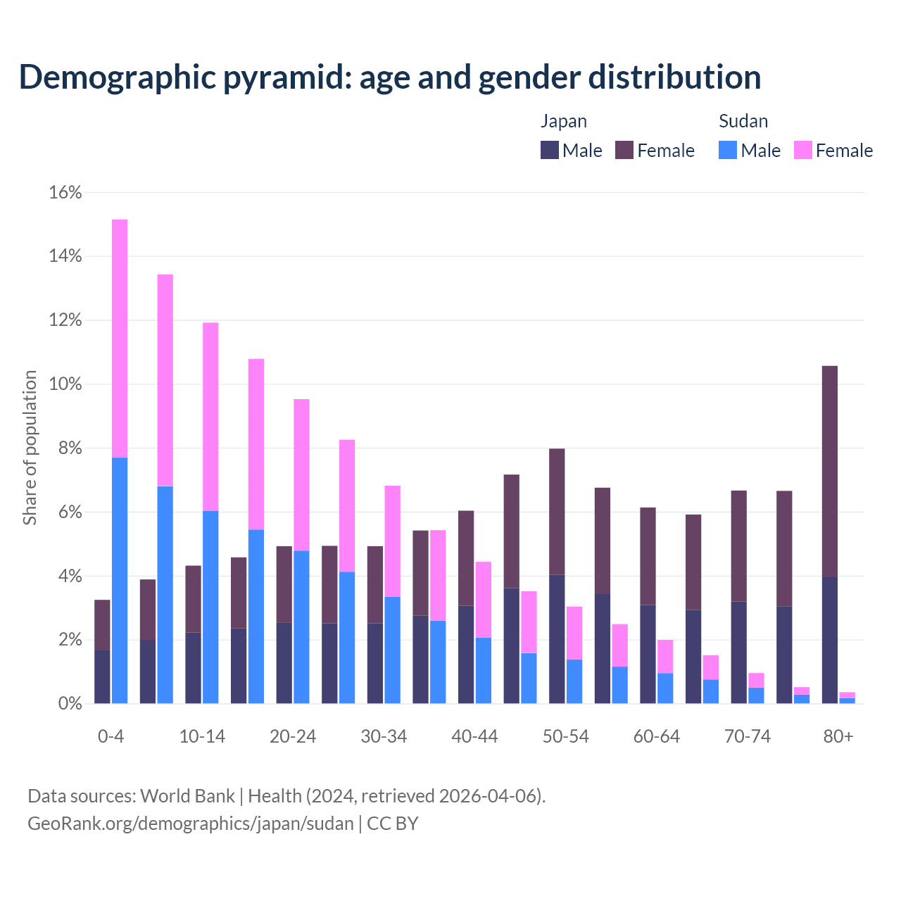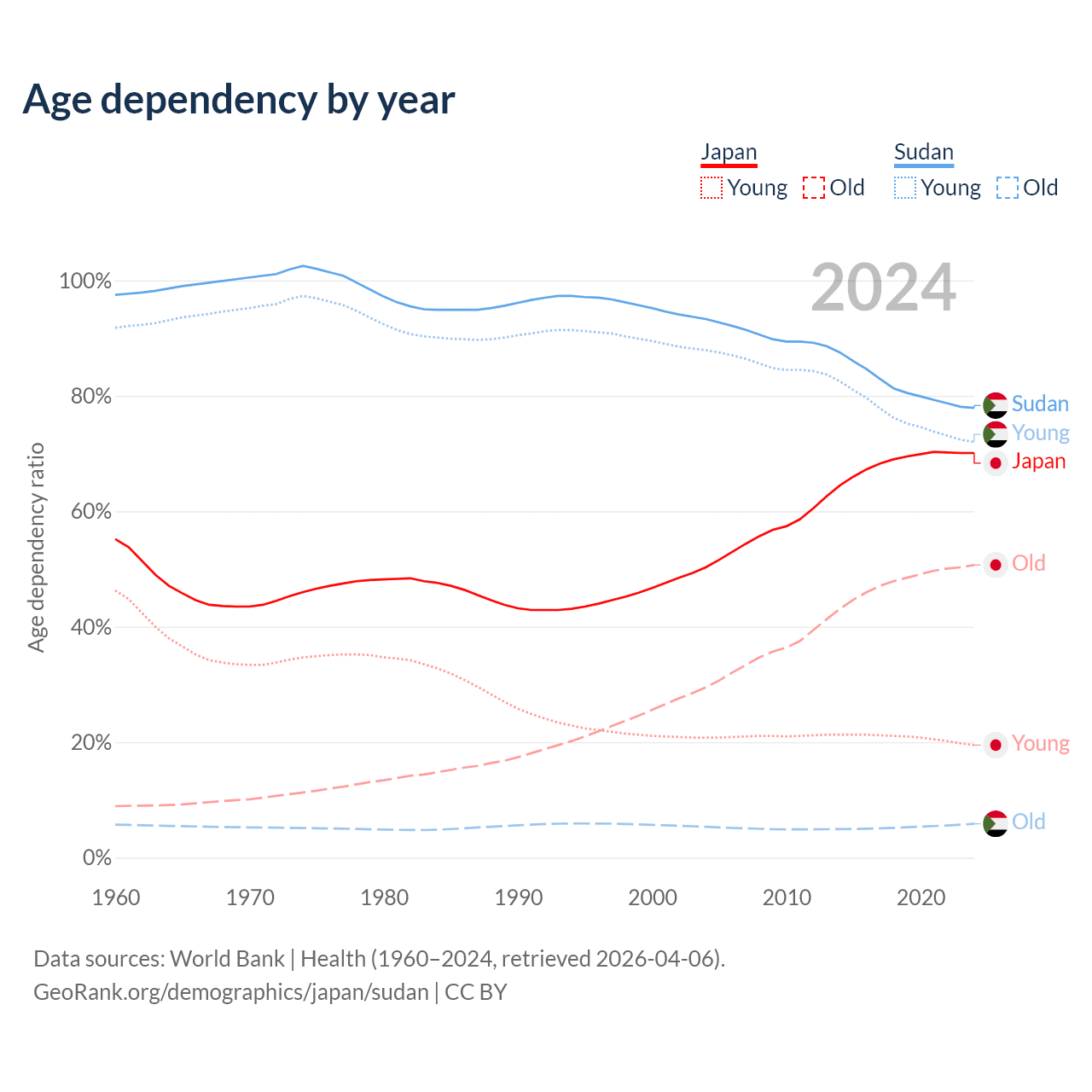 - Japan is ranked 2/196 by median age (oldest to youngest) vs 172/196 for Sudan.