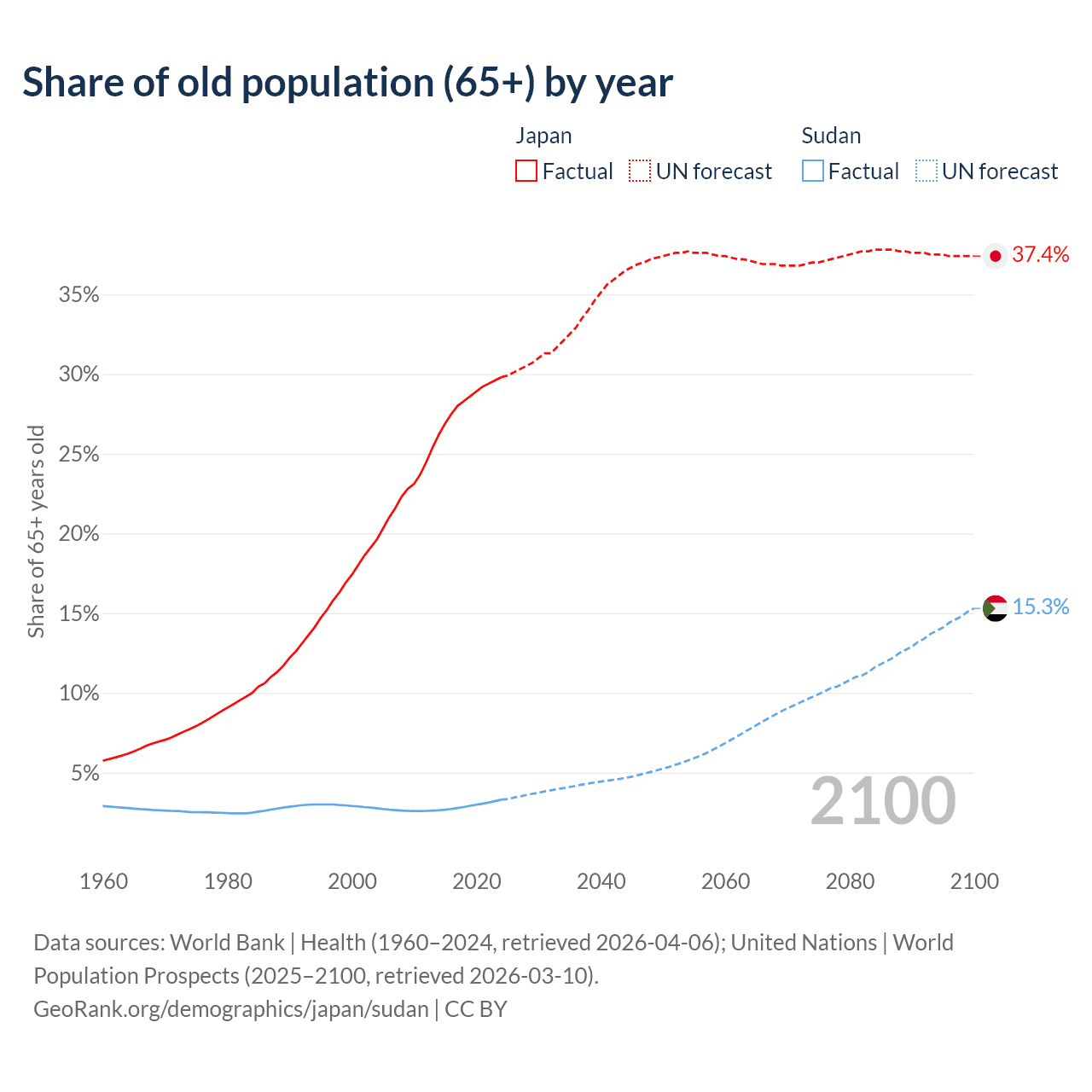 The share of older people aged 65 and over is 29.8% in Japan and 3.3% in Sudan. Life expectancy in Japan compared to Sudan .