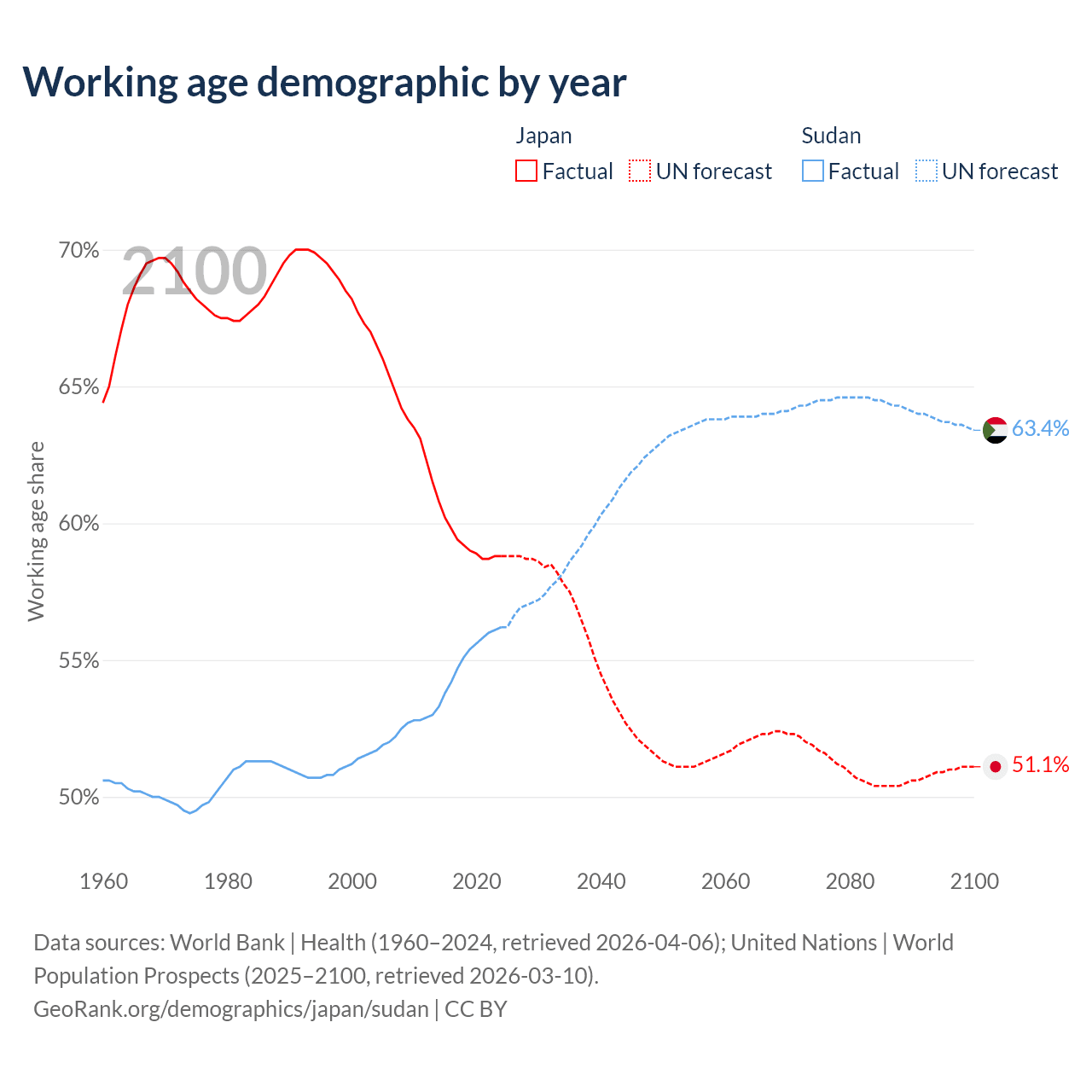 - Japan has 72.1M working age adults (aged 15-64) vs 30M in Sudan.