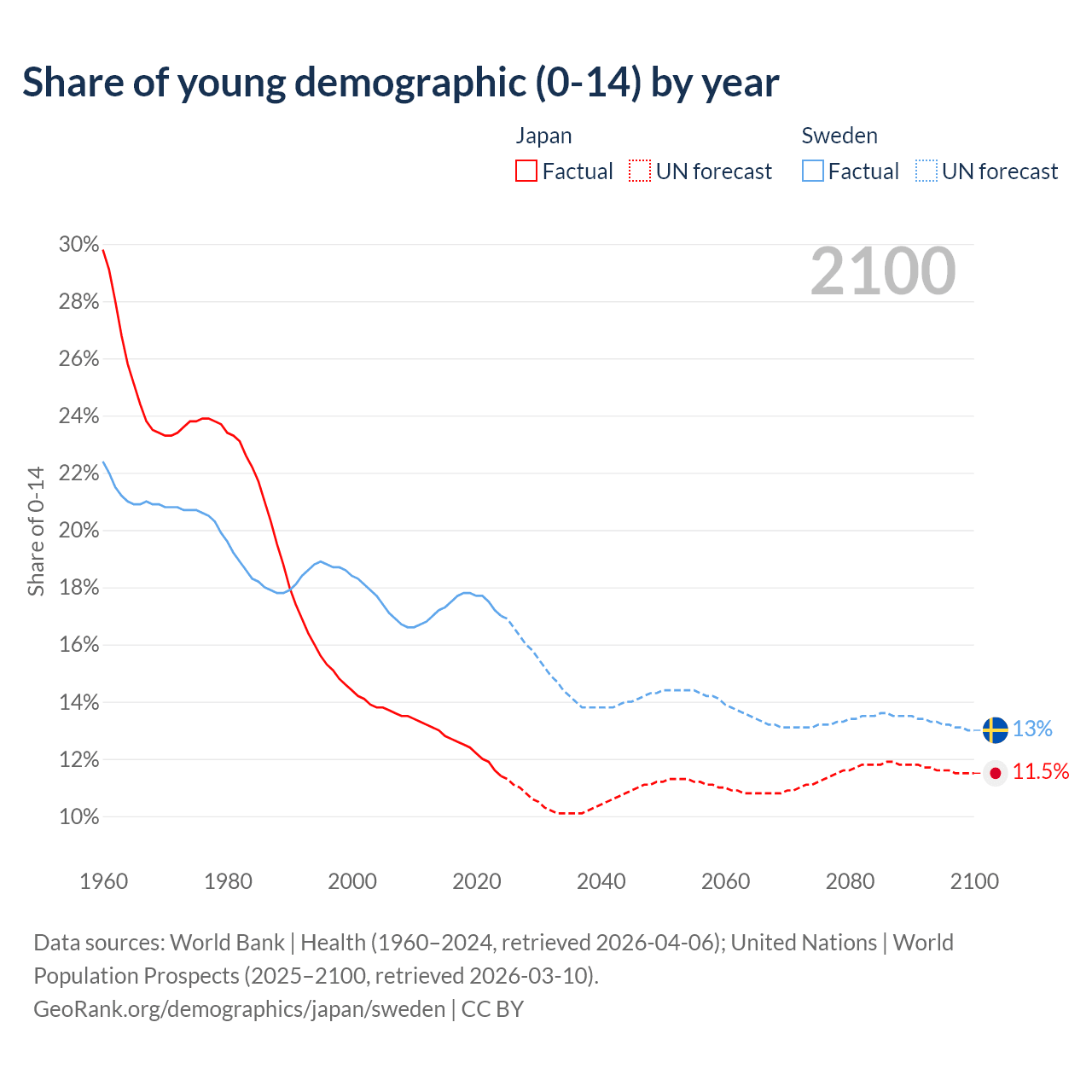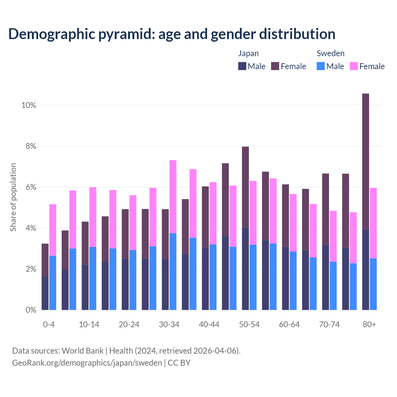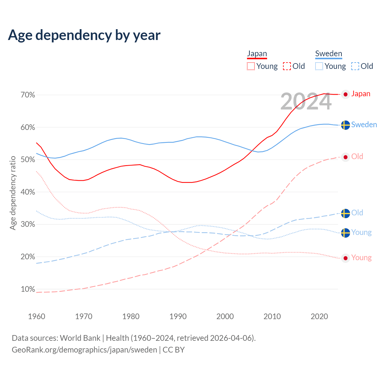 - Japan is ranked 2/196 by median age (oldest to youngest) vs 39/196 for Sweden.