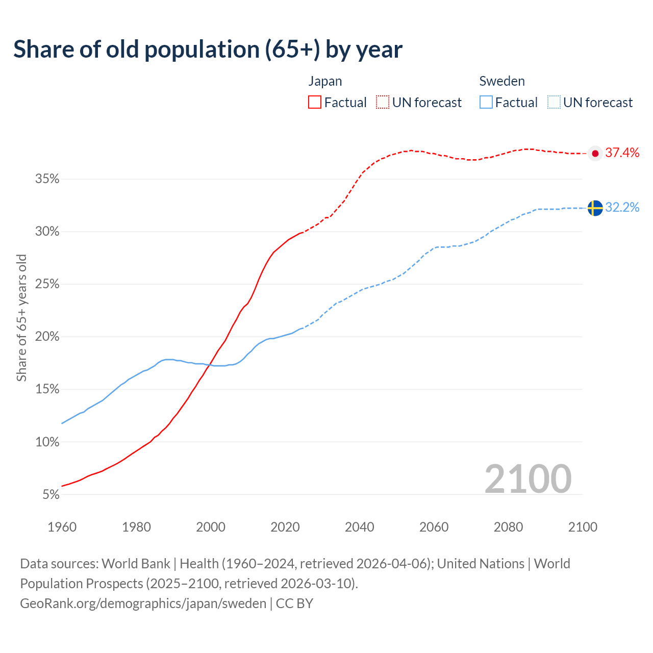 The share of older people aged 65 and over is 29.8% in Japan and 20.7% in Sweden. Life expectancy in Japan compared to Sweden .
