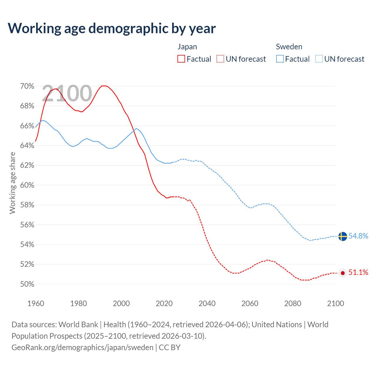 - Japan has 72.1M working age adults (aged 15-64) vs 6.65M in Sweden.