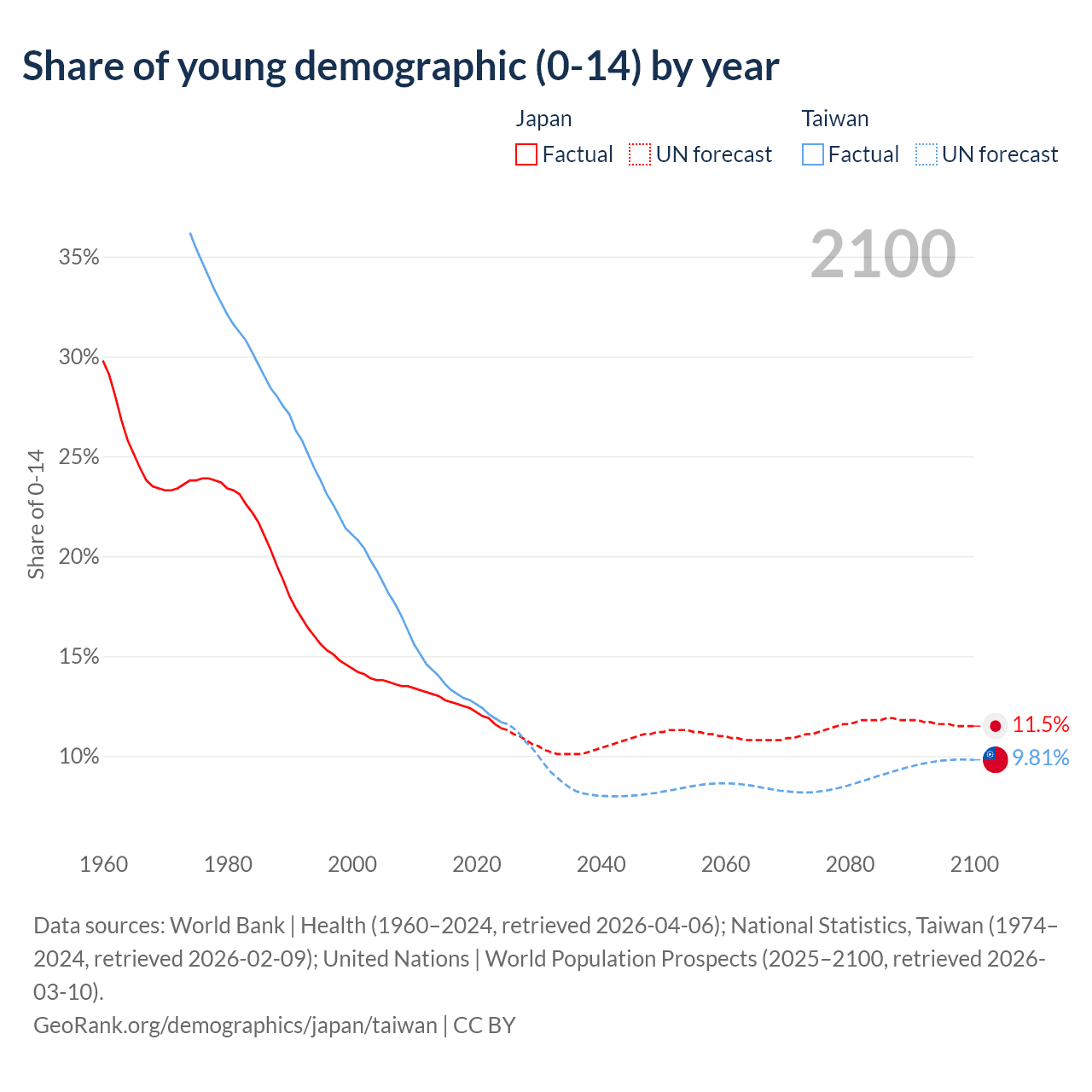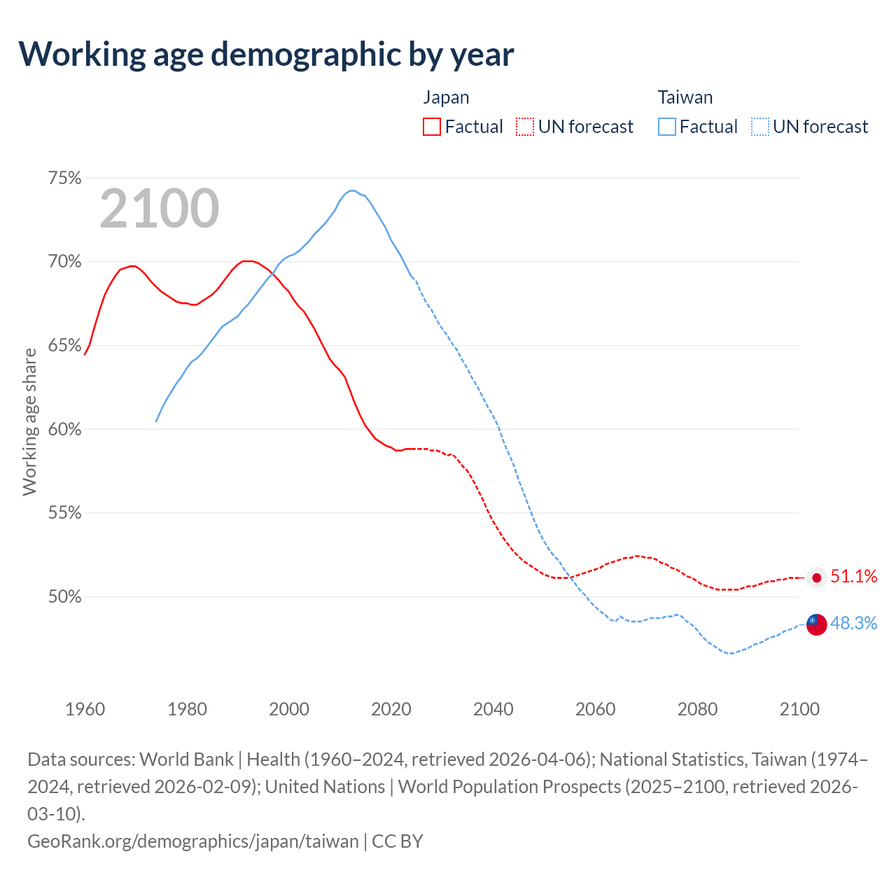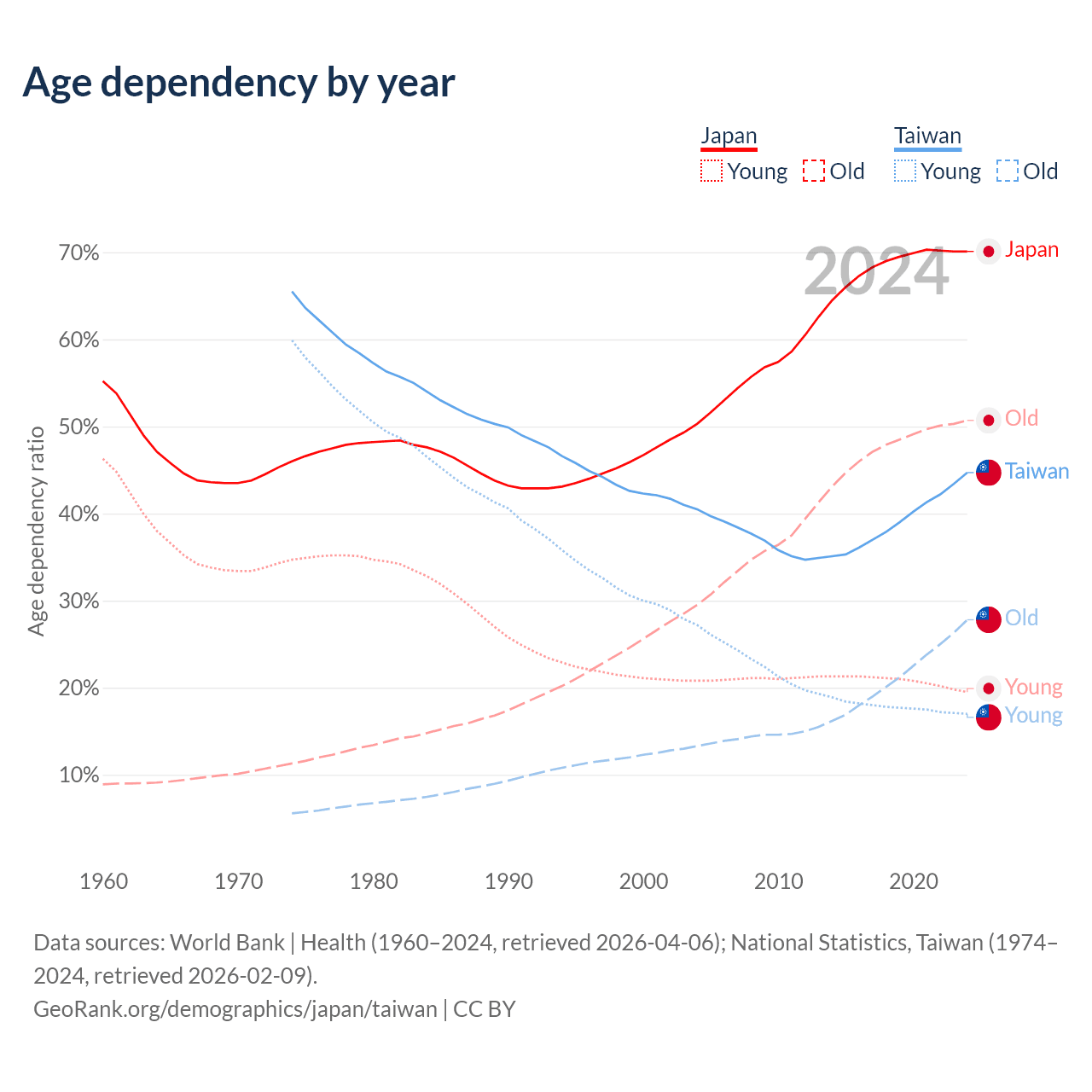 Data sources: World Bank | Health (1960–2024, retrieved 2026-04-06); U.S. Census Bureau (1960–2024, retrieved 2026-02-08); National Statistics, Taiwan (1974–2024, retrieved 2026-02-09).