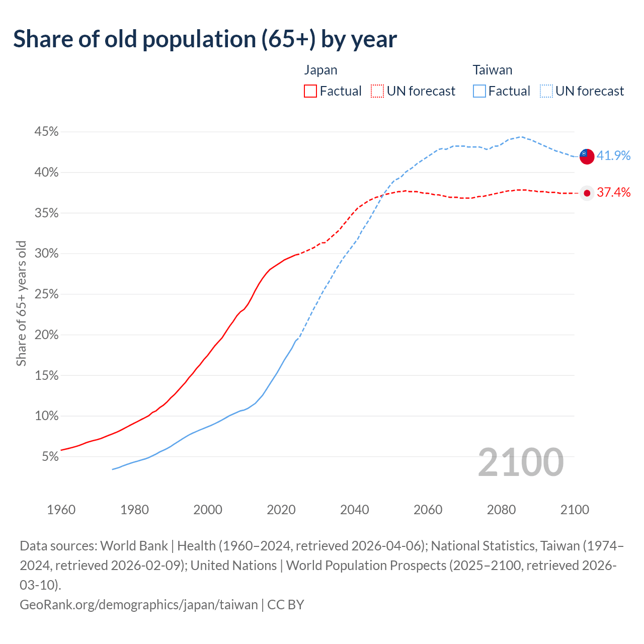 Median age Japan vs Taiwan, 1960-2100