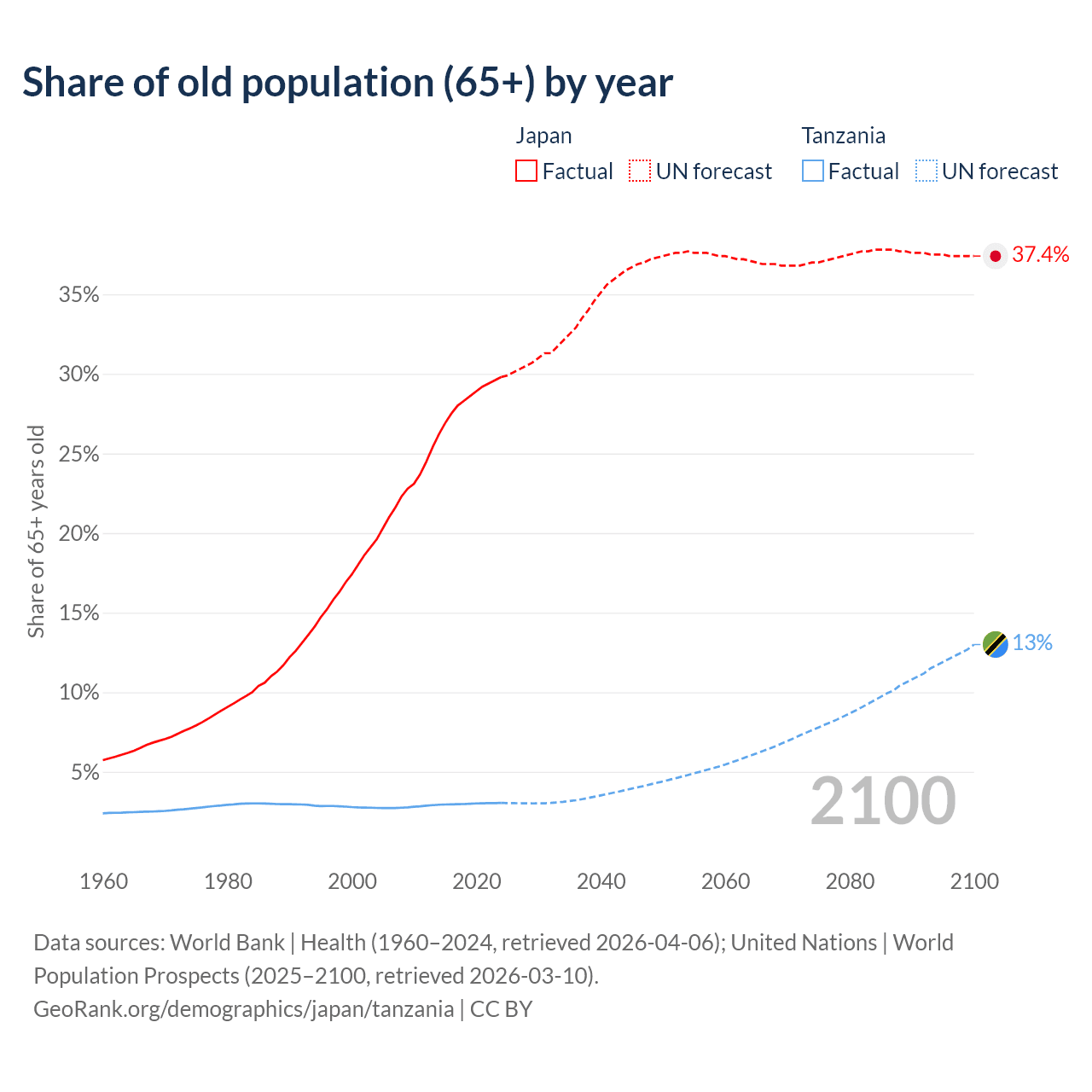 The share of older people aged 65 and over is 29.8% in Japan and 3.05% in Tanzania. Life expectancy in Japan compared to Tanzania .
