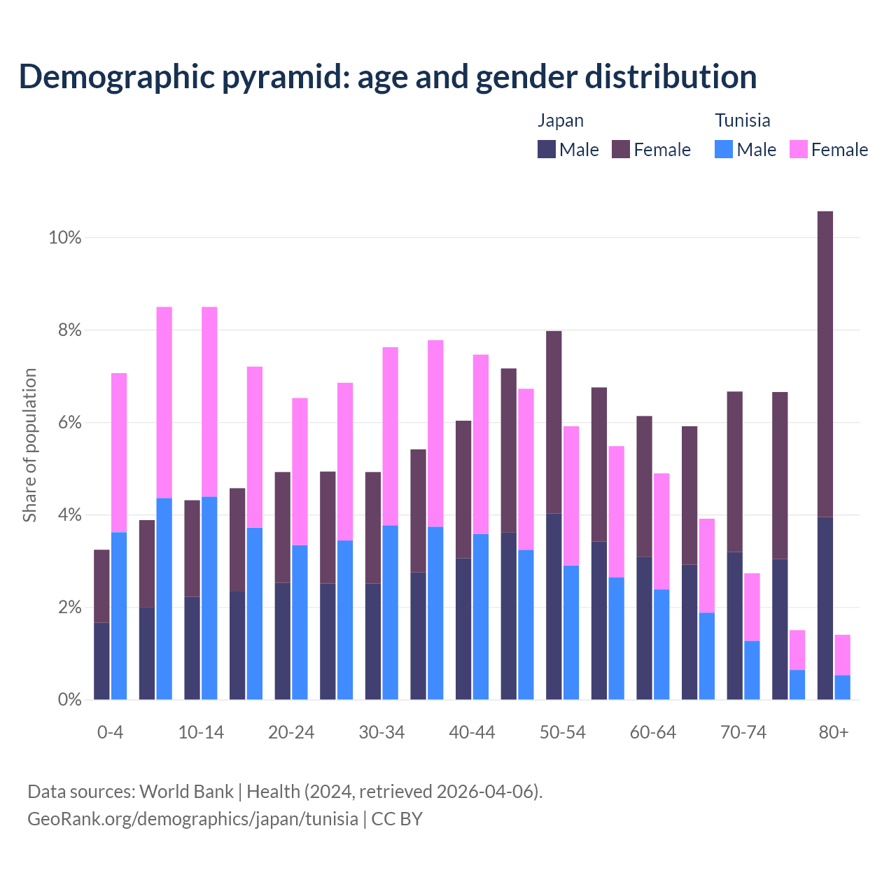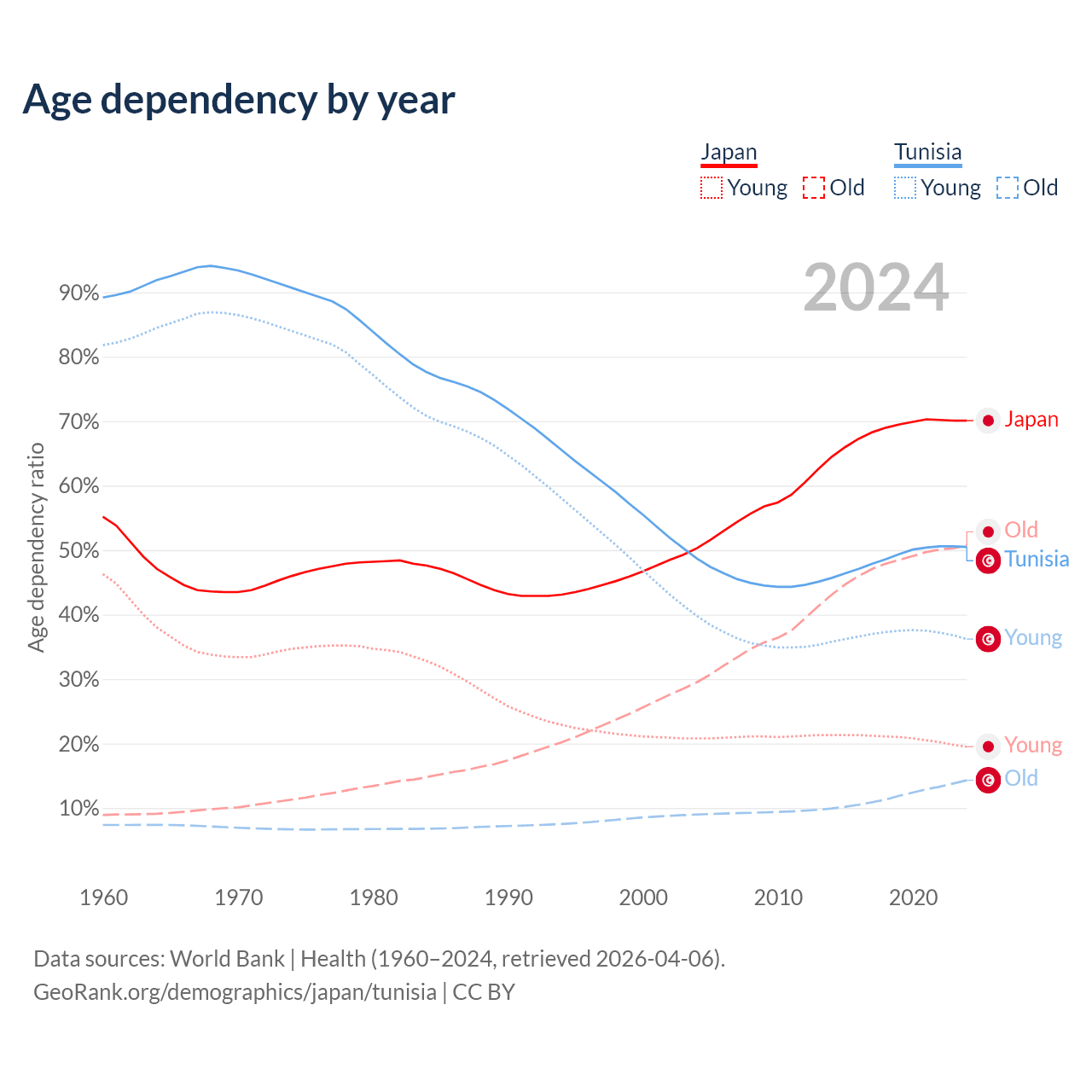- Japan is ranked 2/196 by median age (oldest to youngest) vs 86/196 for Tunisia.