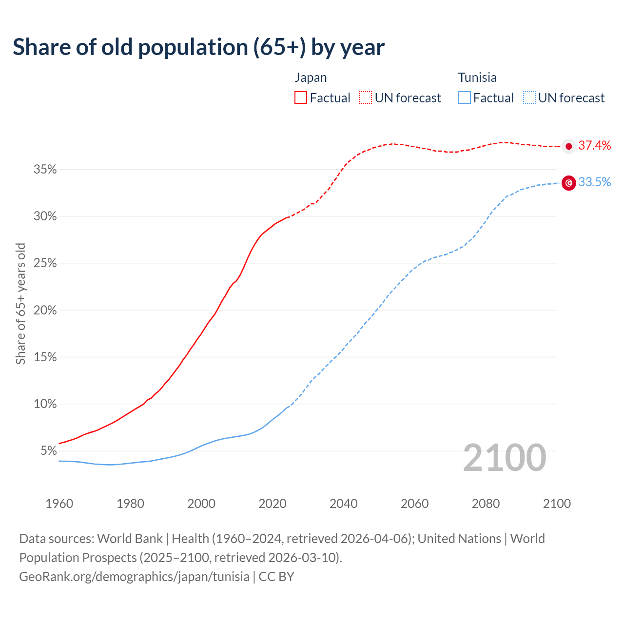 The share of older people aged 65 and over is 29.8% in Japan and 9.53% in Tunisia. Life expectancy in Japan compared to Tunisia .