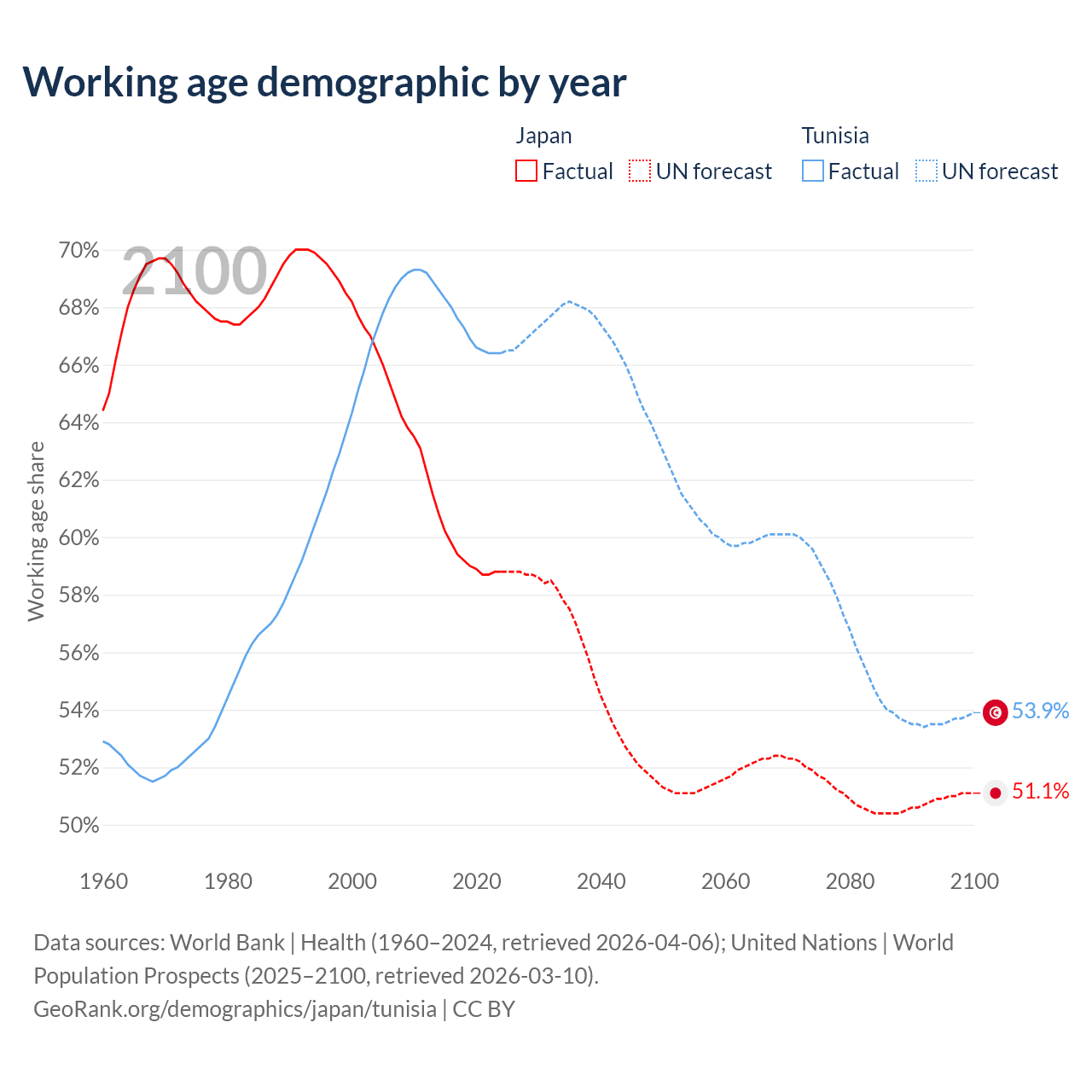 - Japan has 72.1M working age adults (aged 15-64) vs 8.26M in Tunisia.