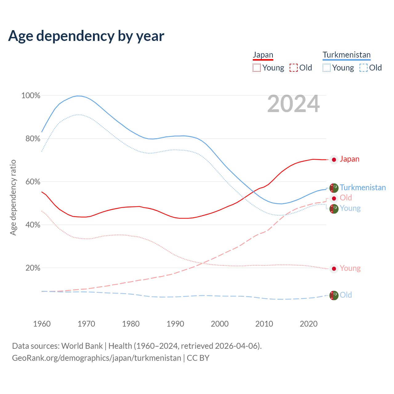 - Japan is ranked 2/196 by median age (oldest to youngest) vs 119/196 for Turkmenistan.