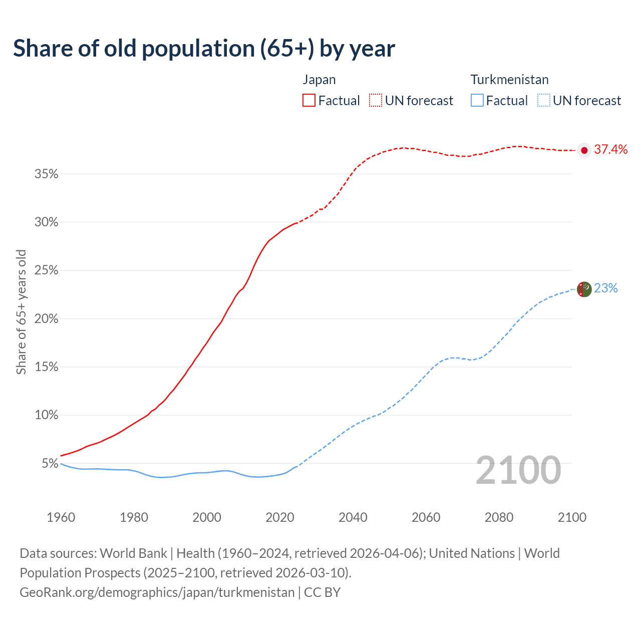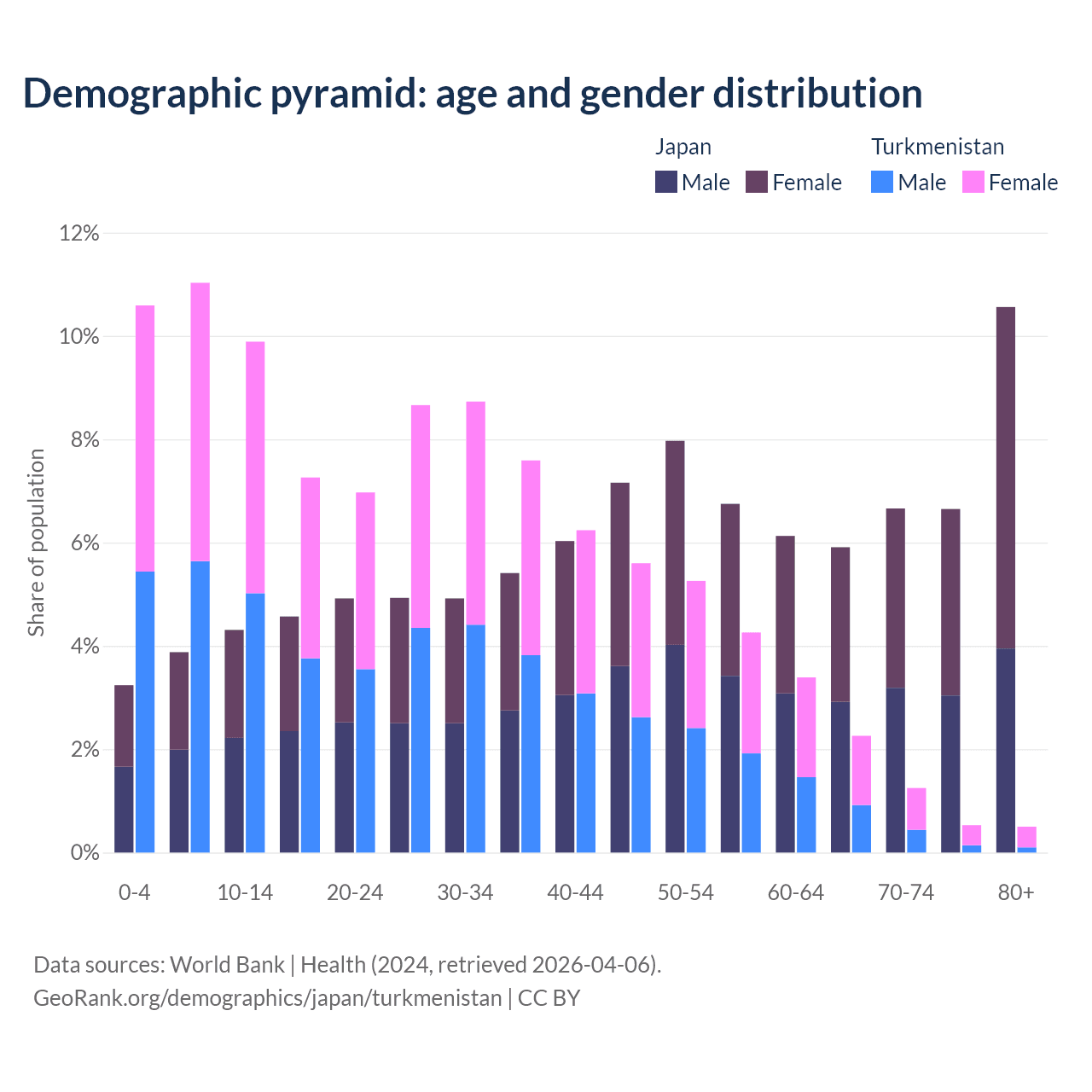 The share of older people aged 65 and over is 29.8% in Japan and 4.53% in Turkmenistan. Life expectancy in Japan compared to Turkmenistan .