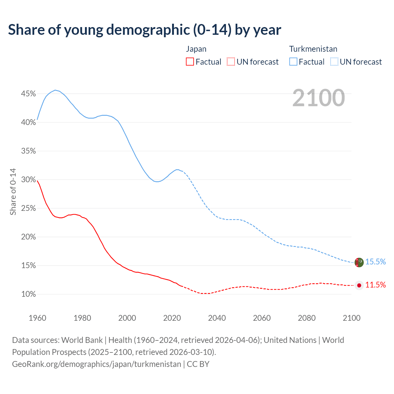 - The share of young demographic (0-15 years old) in Japan is 11.4% vs 31.5% in Turkmenistan.