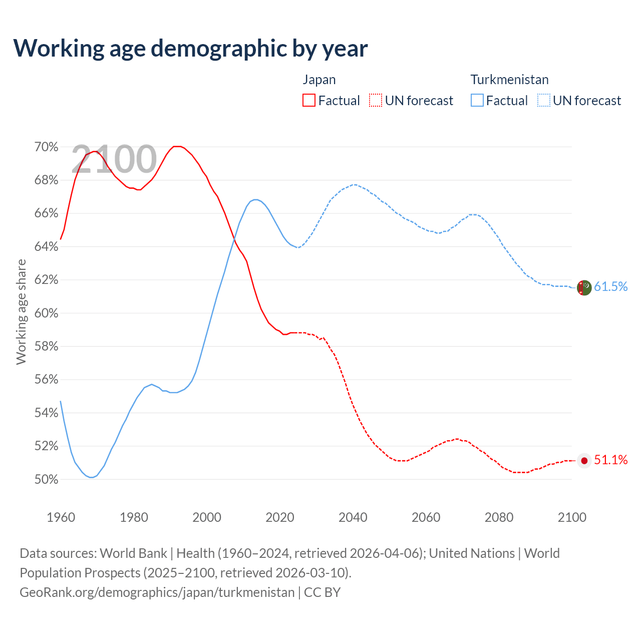 Median age Japan vs Turkmenistan, 1960-2100