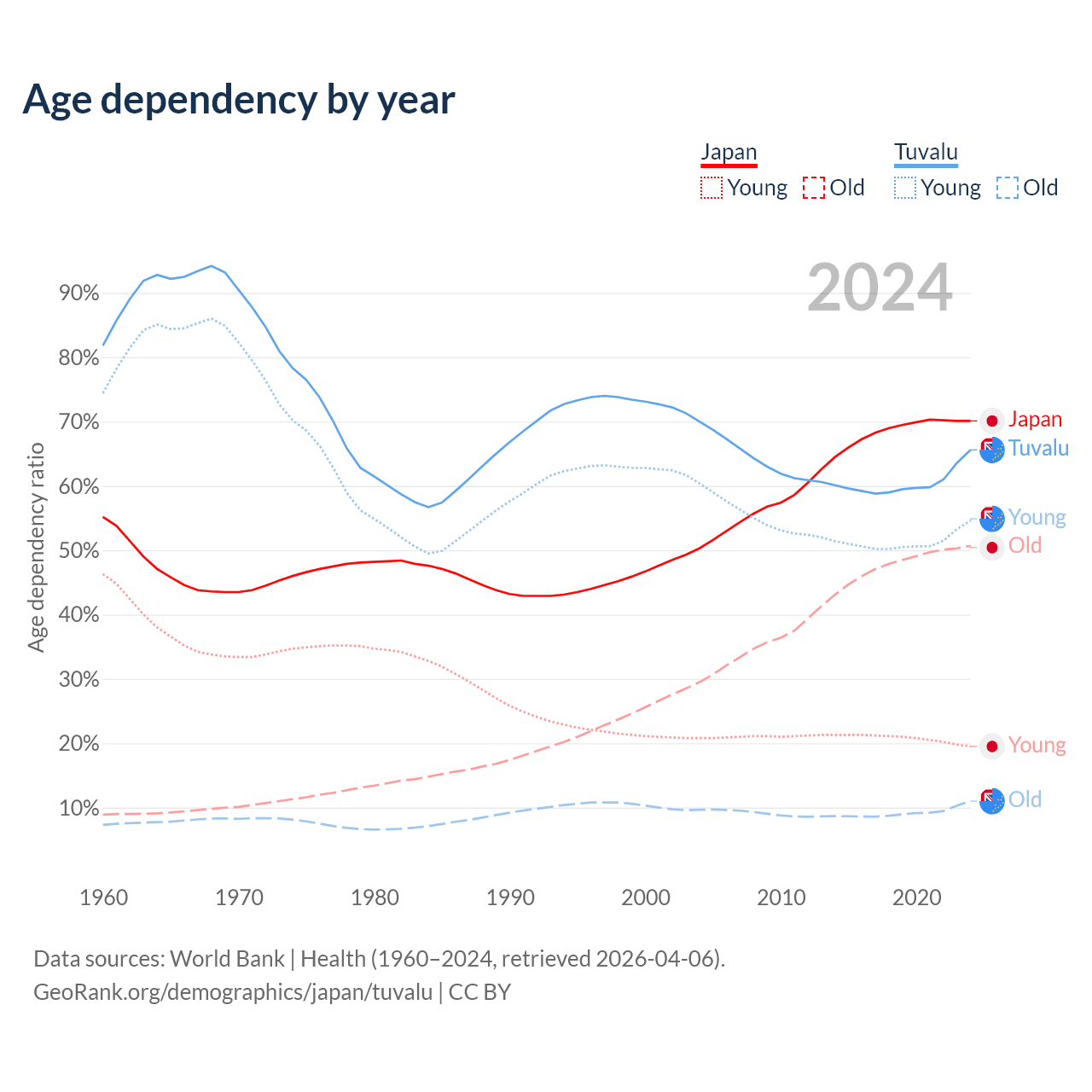 - The share of old-age demographic (65+) in Japan is 29.8% vs 6.67% in Tuvalu.