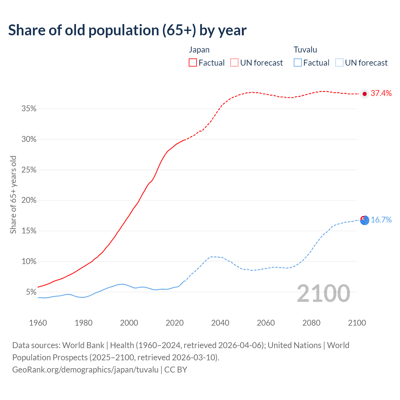 Median age Japan vs Tuvalu, 1960-2100