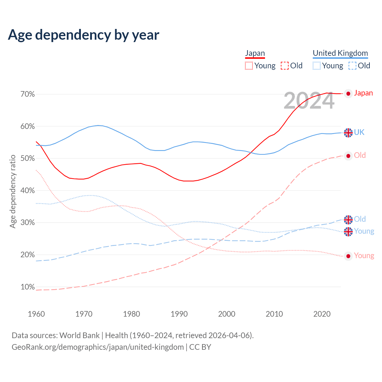 - Japan is ranked 2/196 by median age (oldest to youngest) vs 41/196 for the United Kingdom.