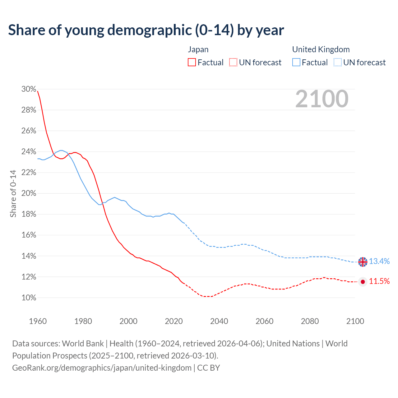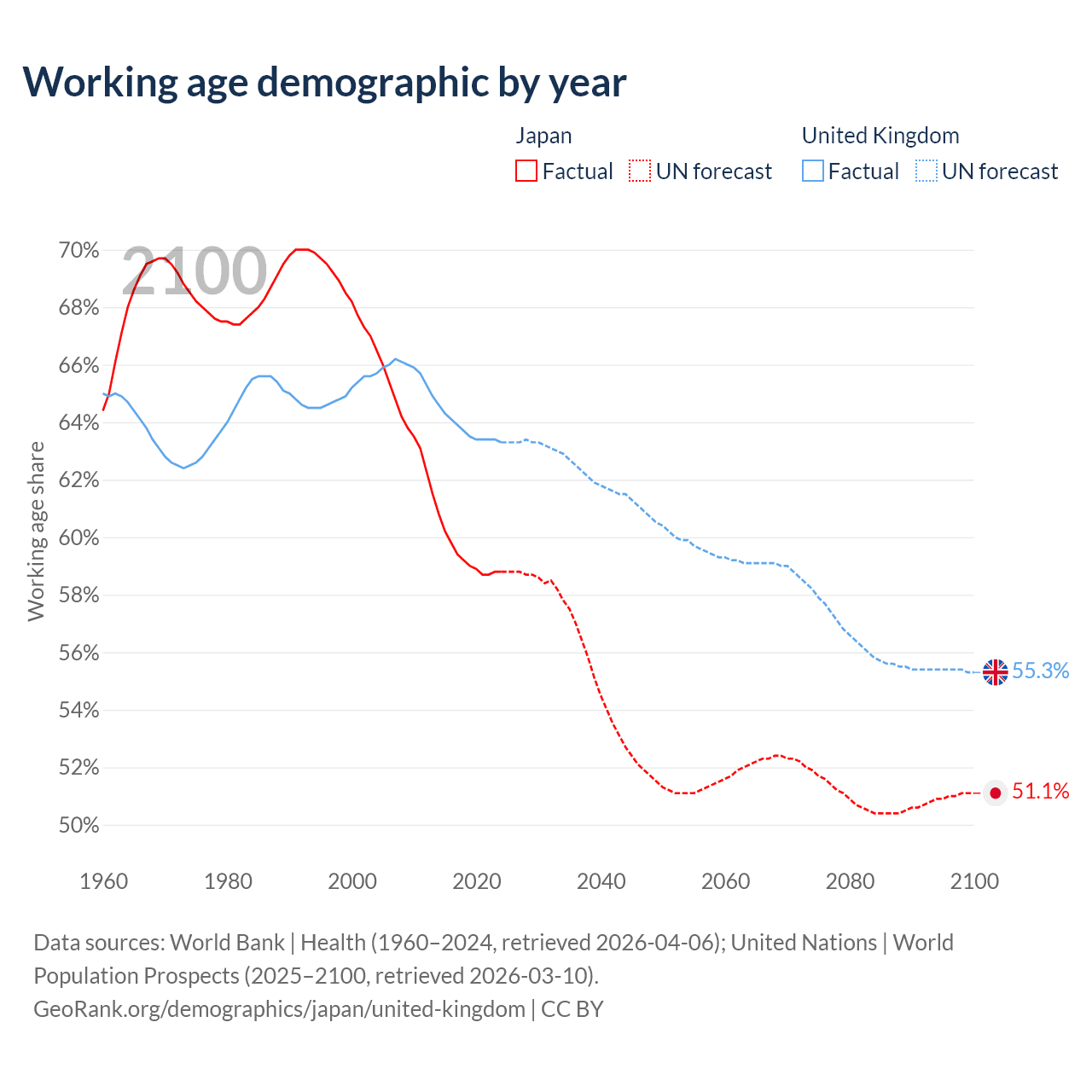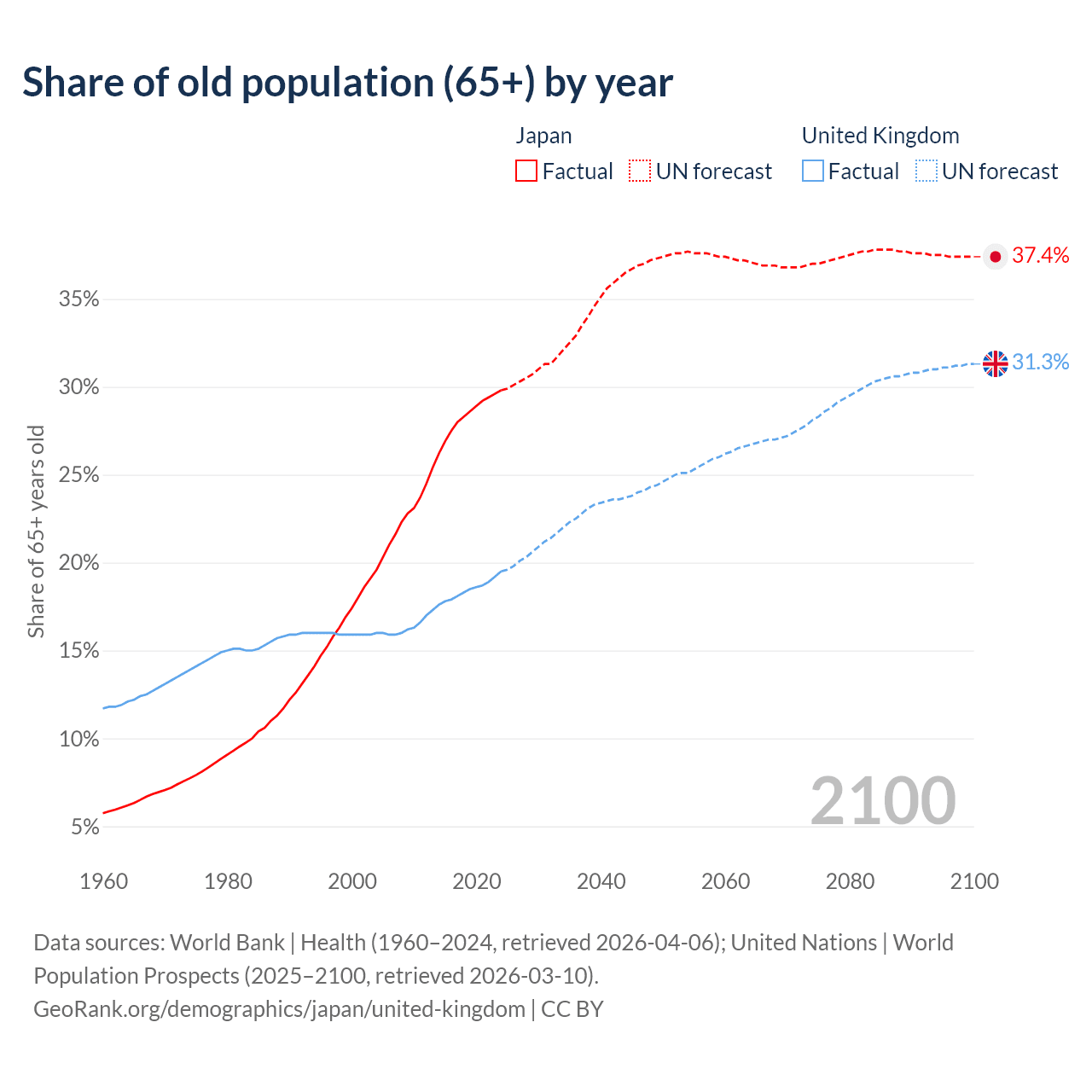 Median age Japan vs United Kingdom, 1960-2100