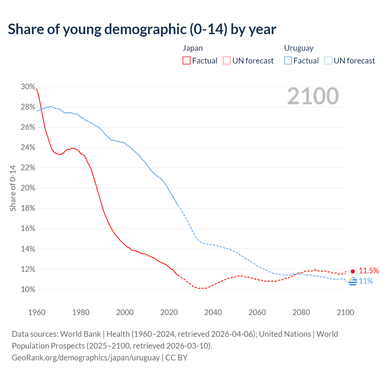 - The share of young demographic (0-15 years old) in Japan is 11.4% vs 18.3% in Uruguay.