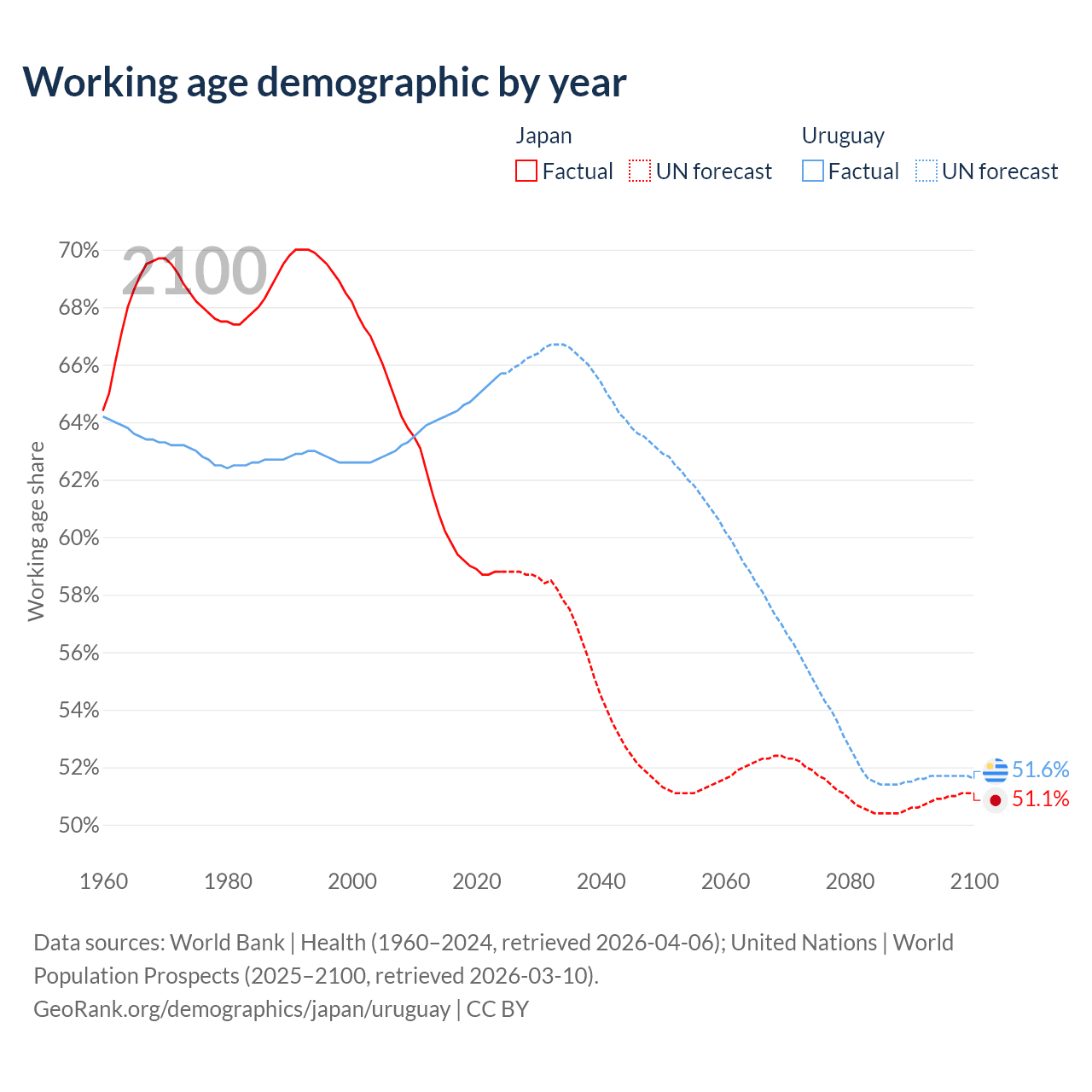 Median age Japan vs Uruguay, 1960-2100