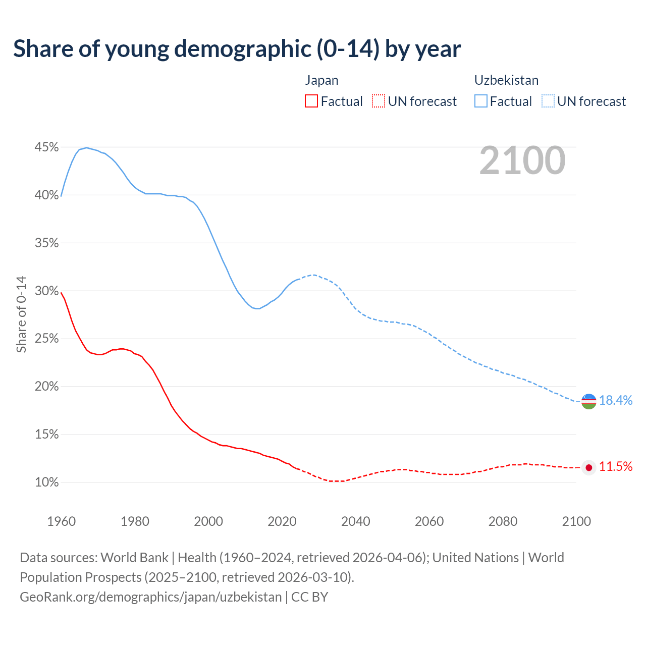 - The share of young demographic (0-15 years old) in Japan is 11.4% vs 31.1% in Uzbekistan.