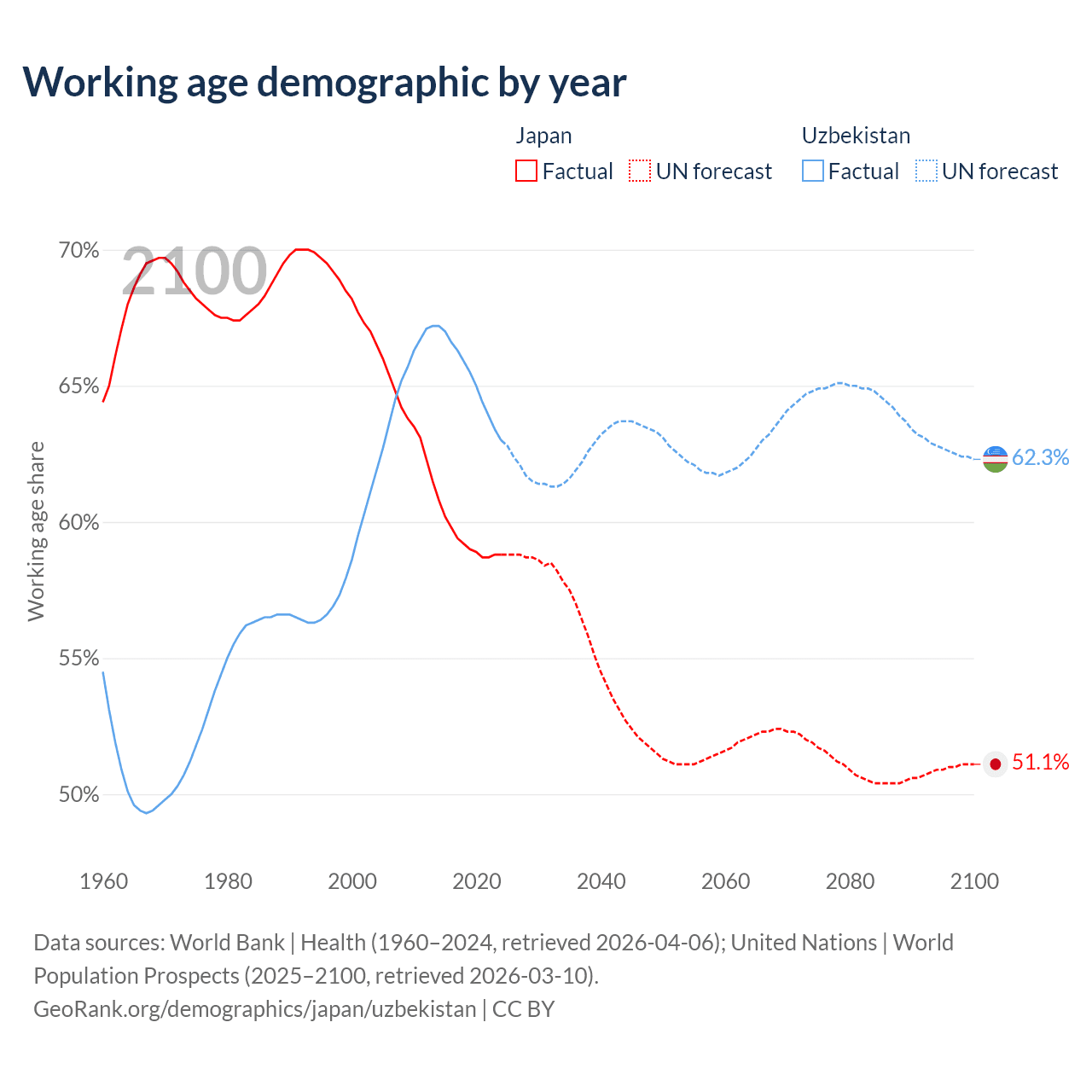 - Japan has 72.1M working age adults (aged 15-64) vs 23.9M in Uzbekistan.