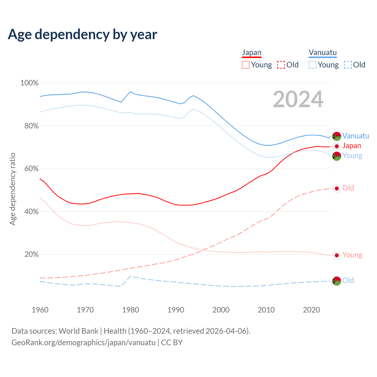 - Japan is ranked 2/196 by median age (oldest to youngest) vs 156/196 for Vanuatu.