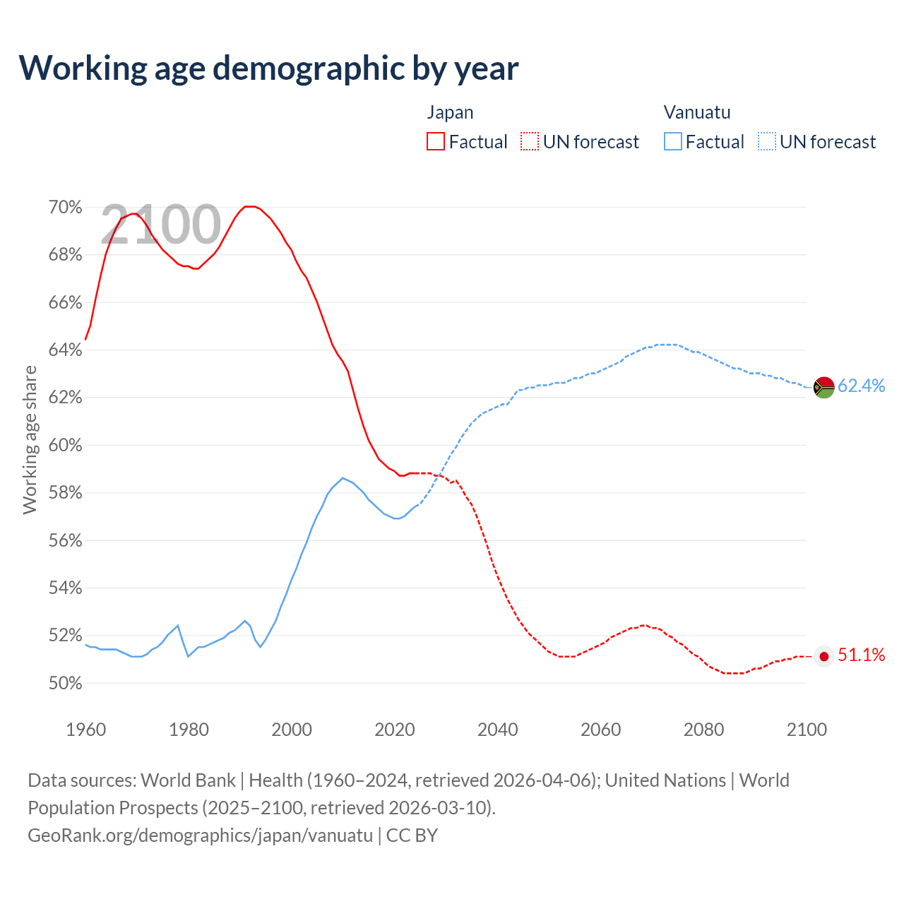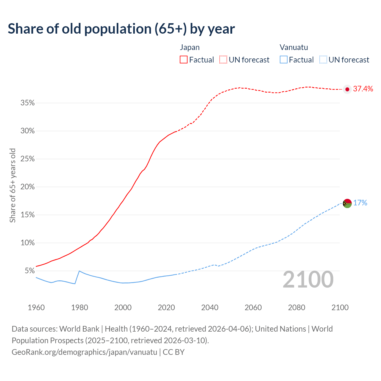 Median age Japan vs Vanuatu, 1960-2100