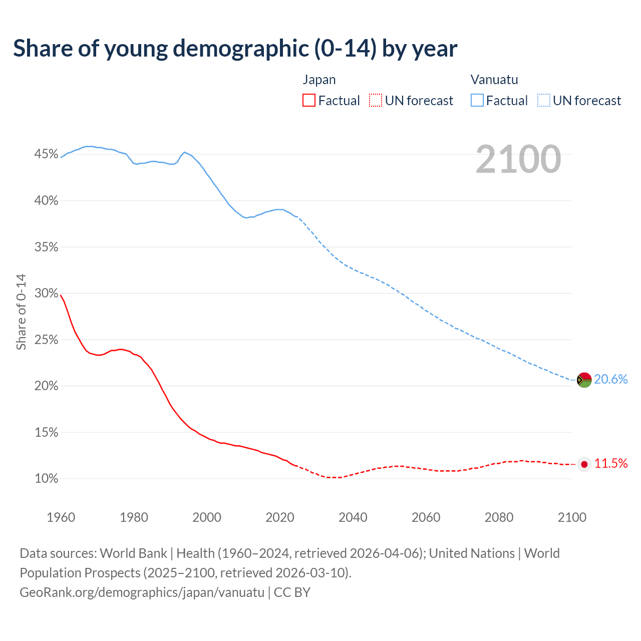 - The share of young demographic (0-15 years old) in Japan is 11.4% vs 38.3% in Vanuatu.