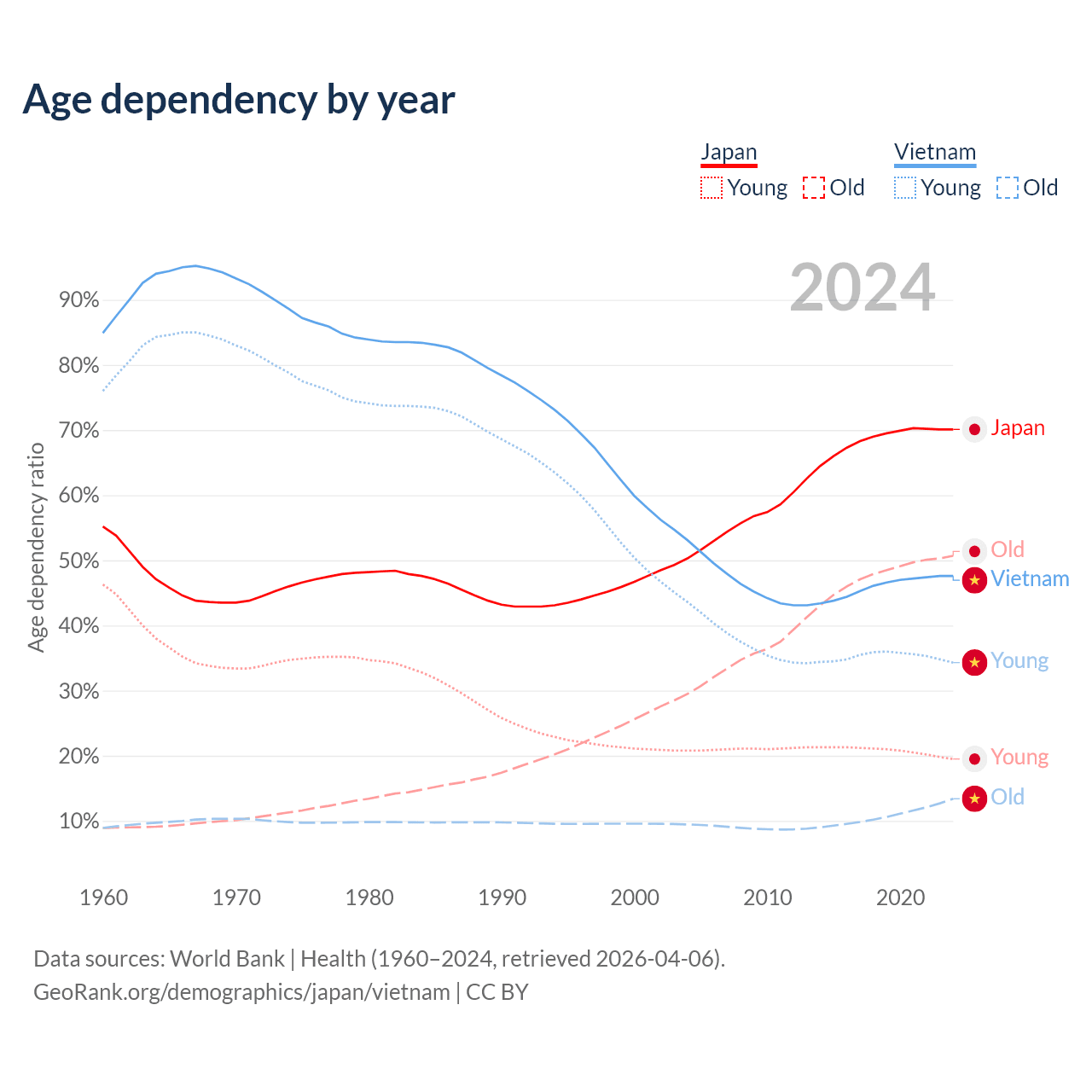 - Japan is ranked 2/196 by median age (oldest to youngest) vs 84/196 for Vietnam.