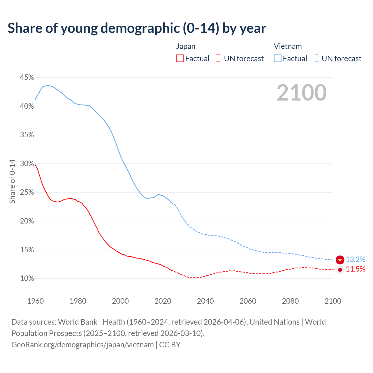 - The share of young demographic (0-15 years old) in Japan is 11.4% vs 23.2% in Vietnam.