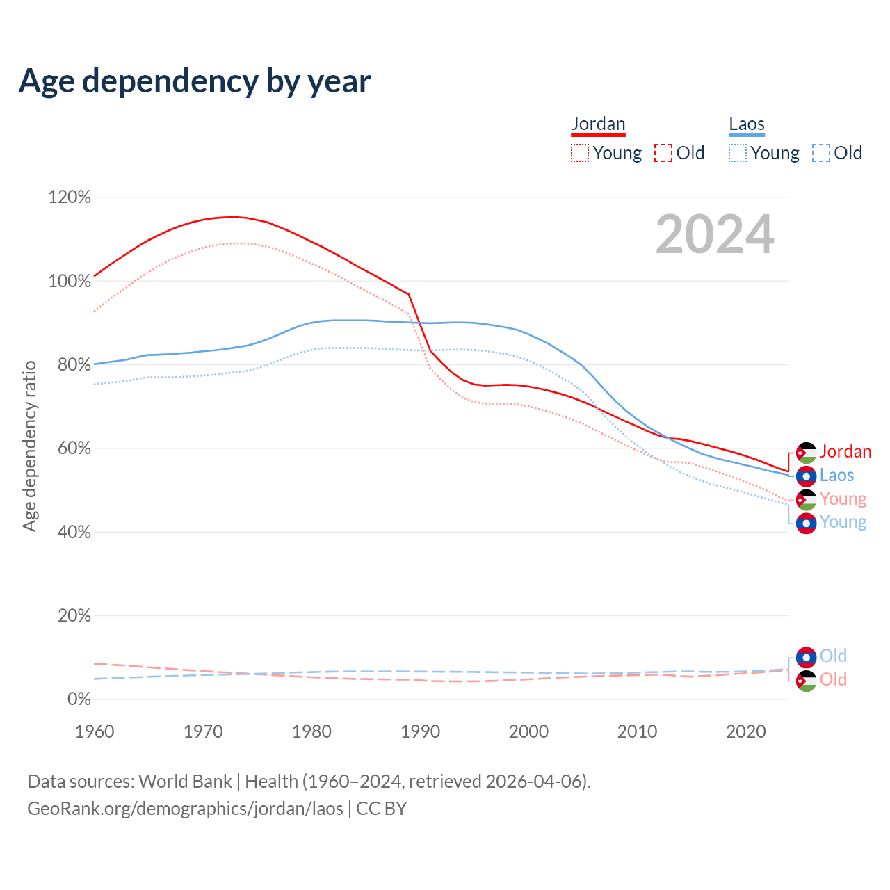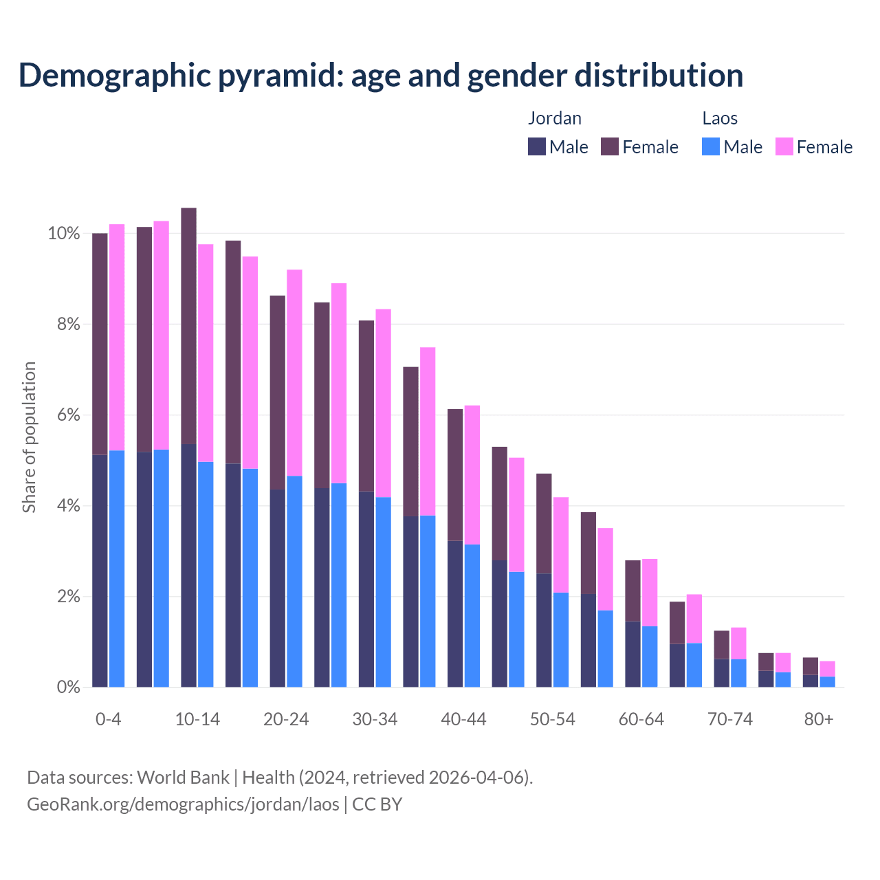 - Jordan is ranked 131/196 by median age (oldest to youngest) vs 130/196 for Laos.