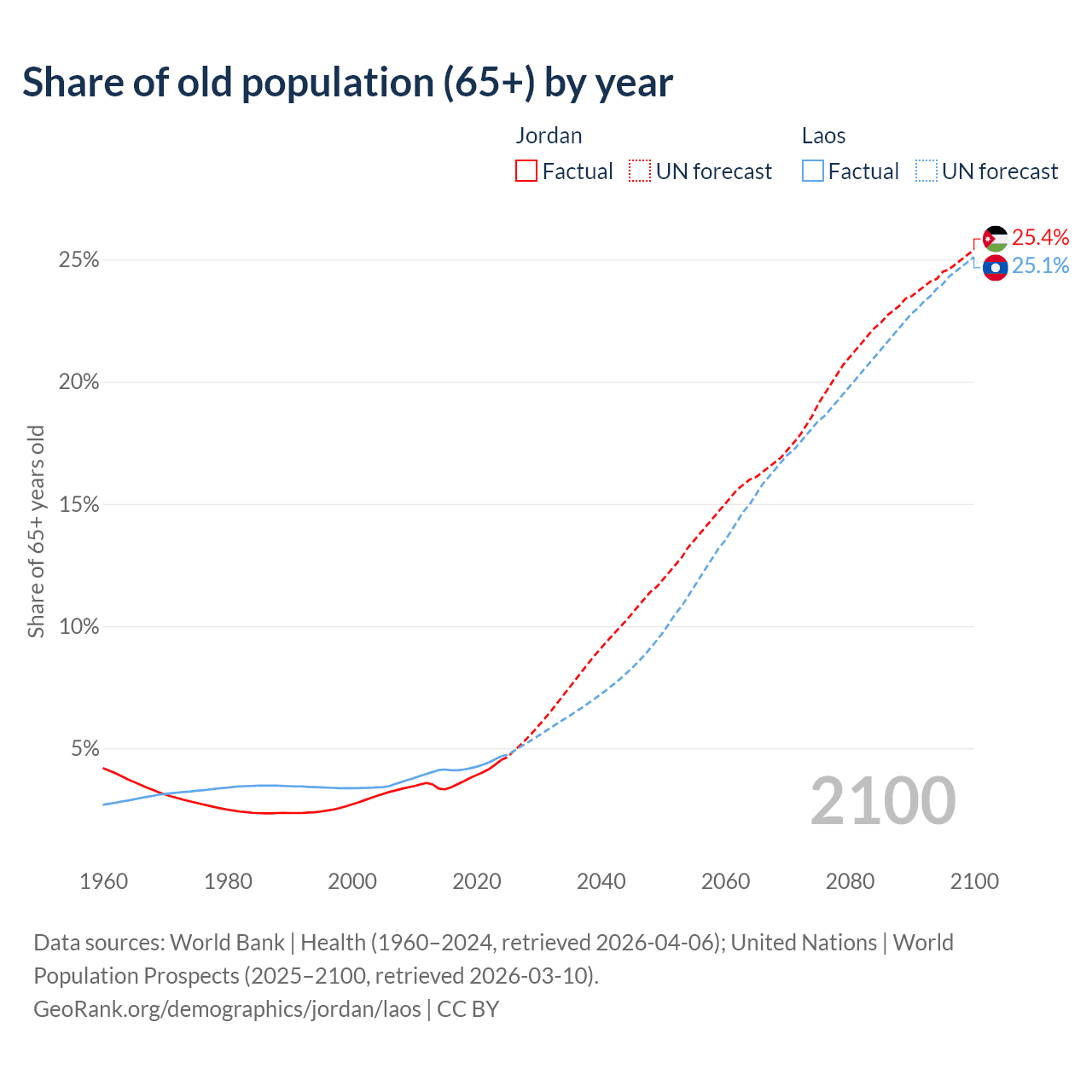 - The share of old-age demographic (65+) in Jordan is 4.52% vs 4.67% in Laos.