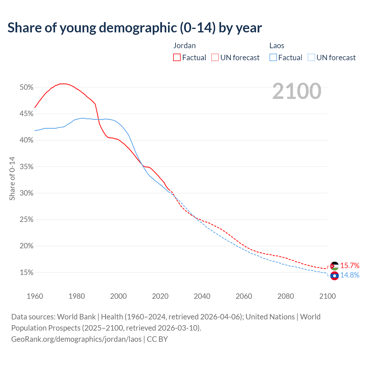 - The share of young demographic (0-15 years old) in Jordan is 30.7% vs 30.2% in Laos.