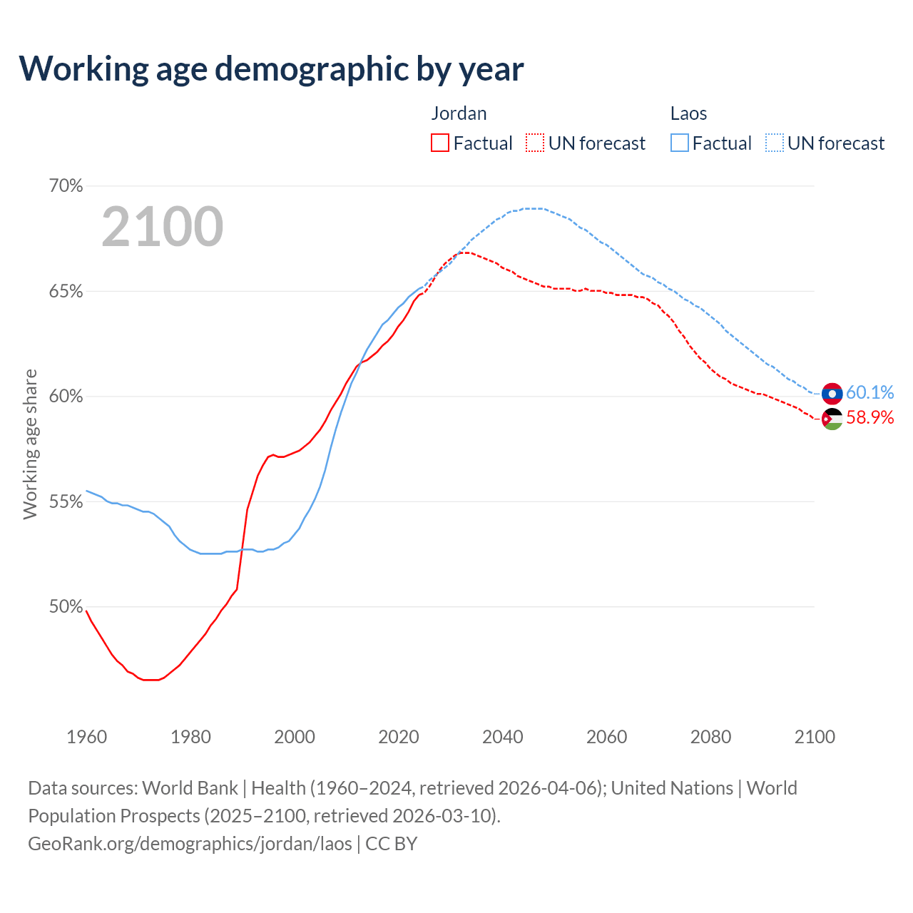 - Jordan has 7.49M working age adults (aged 15-64) vs 5.21M in Laos.