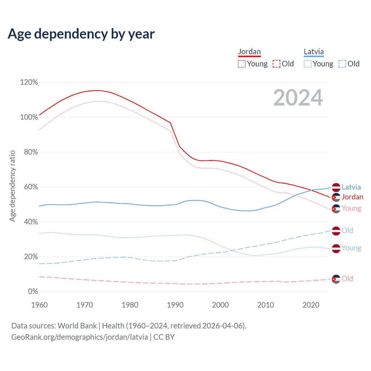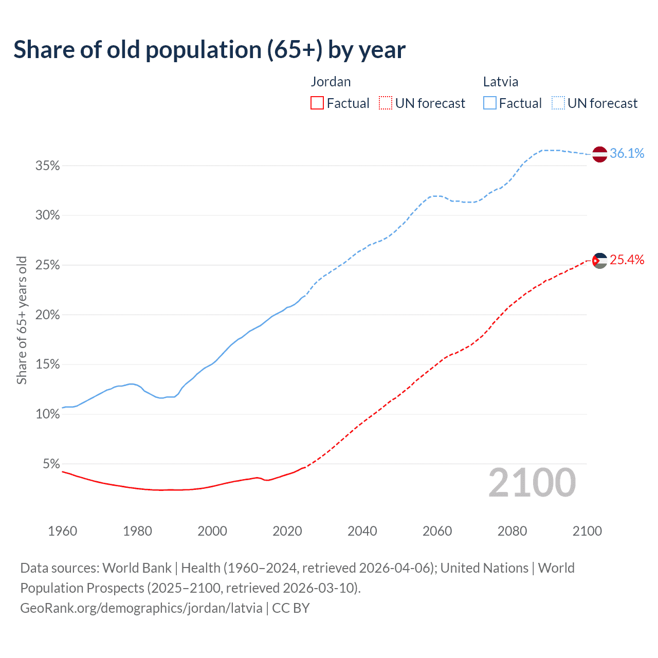 - The share of old-age demographic (65+) in Jordan is 4.52% vs 21.7% in Latvia.