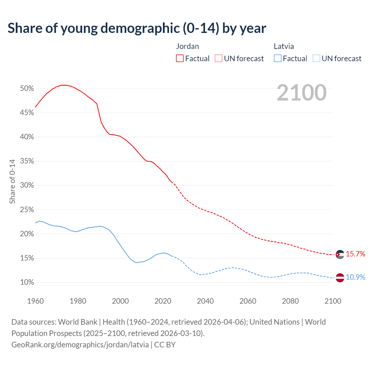 - The share of young demographic (0-15 years old) in Jordan is 30.7% vs 15.4% in Latvia.