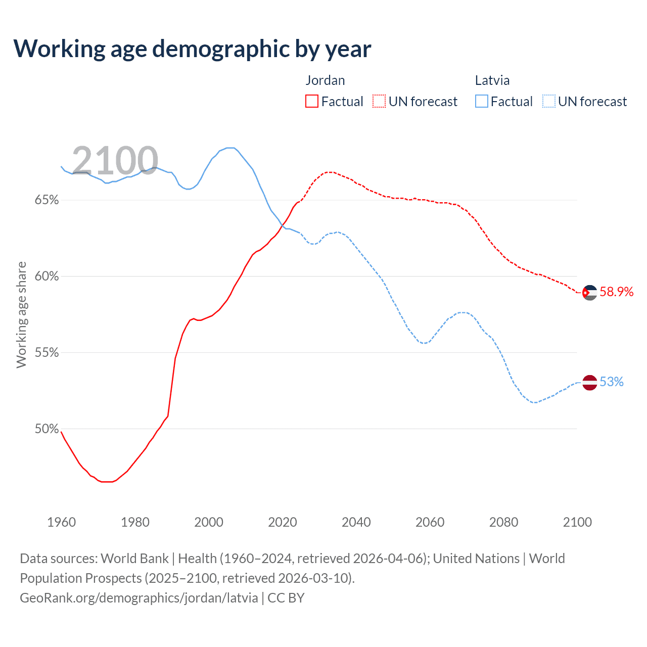 Median age Jordan vs Latvia, 1960-2100