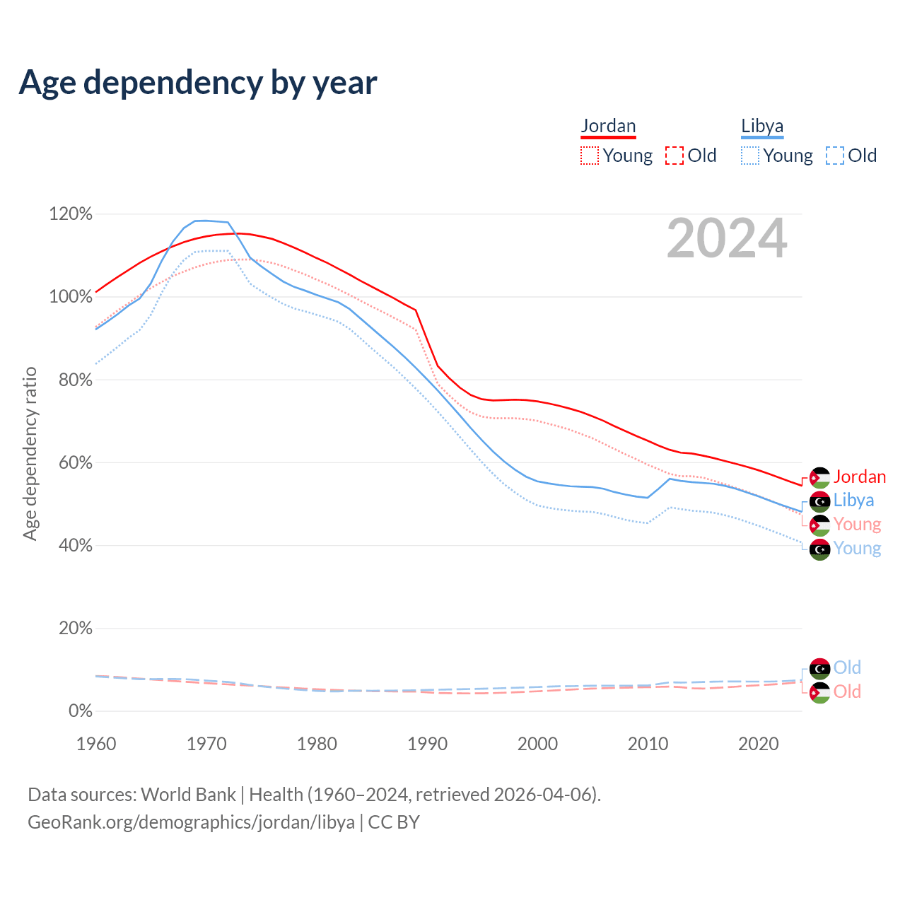 Data sources: World Bank | Health (1960–2024, retrieved 2026-04-06); U.S. Census Bureau (1960–2024, retrieved 2026-02-08).