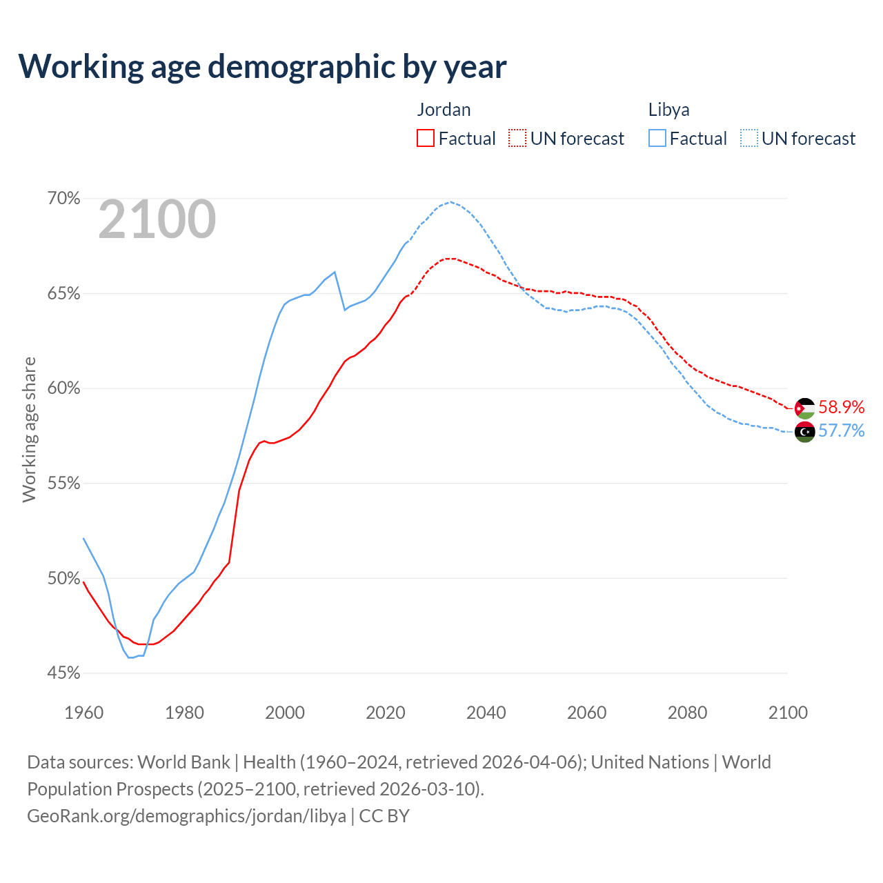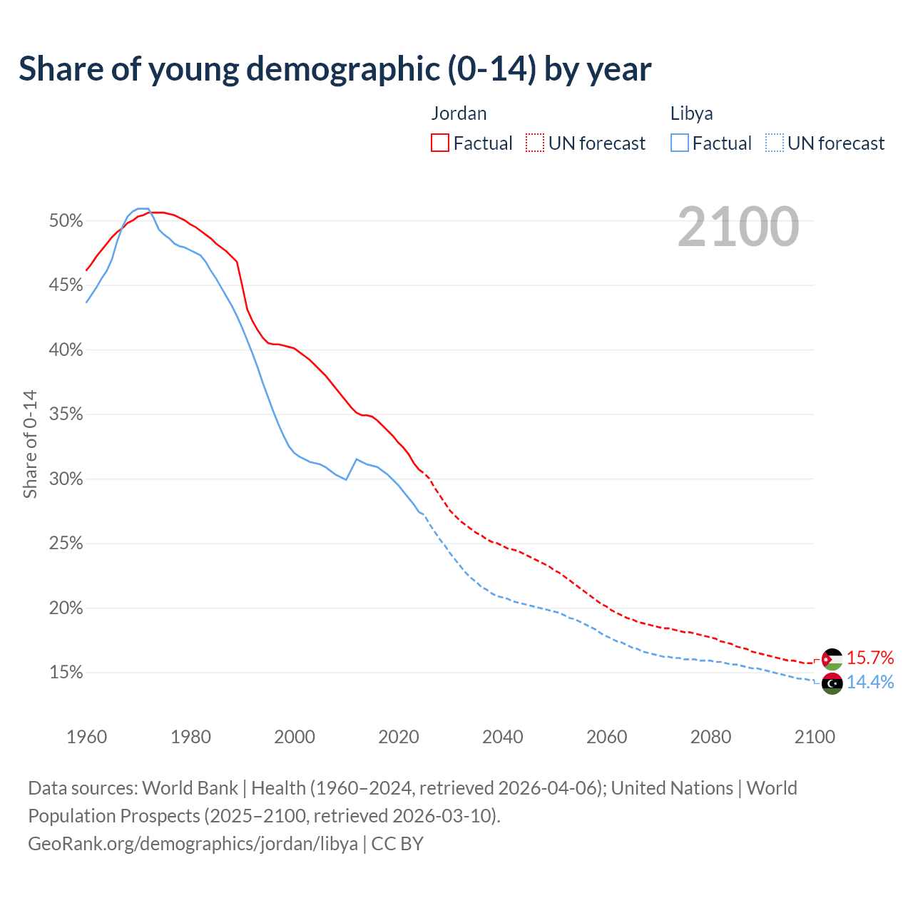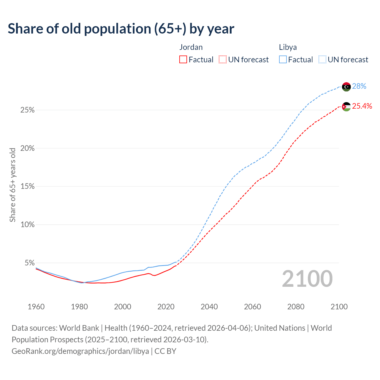 Median age Jordan vs Libya, 1960-2100