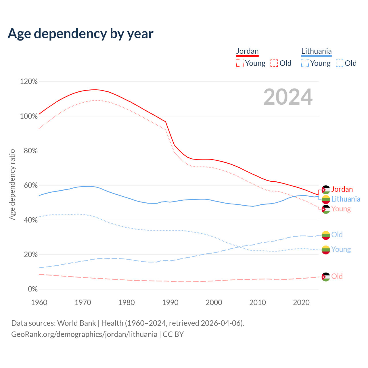 The share of older people aged 65 and over is 4.52% in Jordan and 20.2% in Lithuania. Life expectancy in Jordan compared to Lithuania .