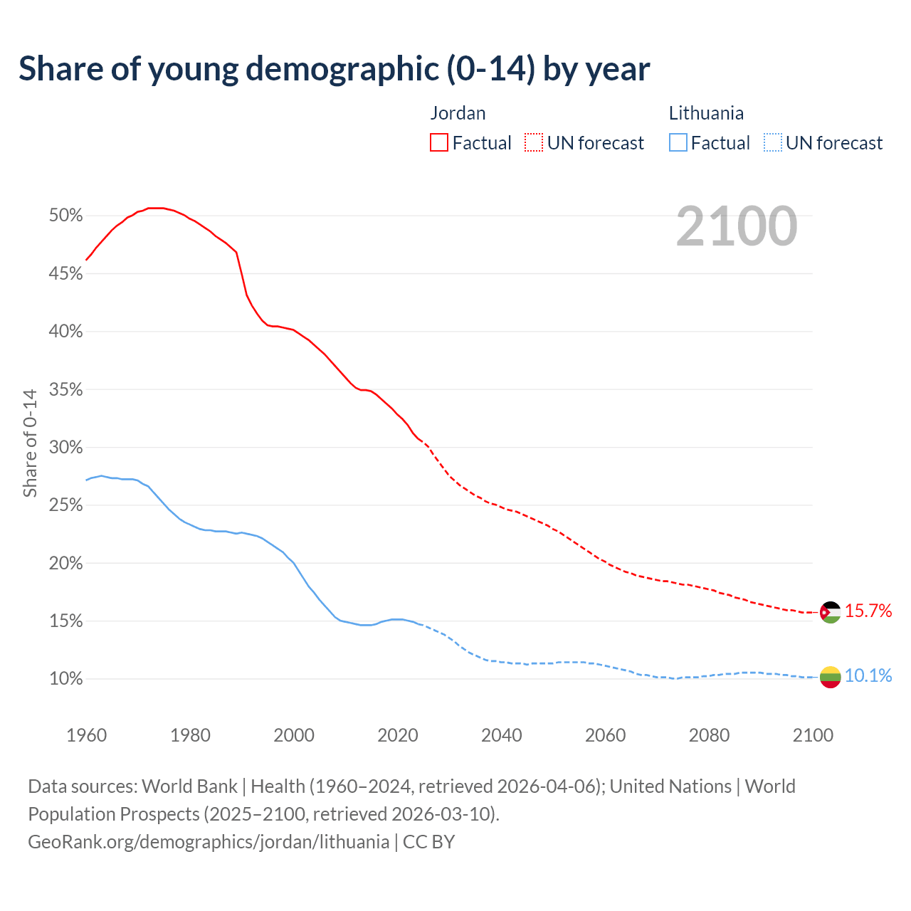 - The share of young demographic (0-15 years old) in Jordan is 30.7% vs 14.7% in Lithuania.