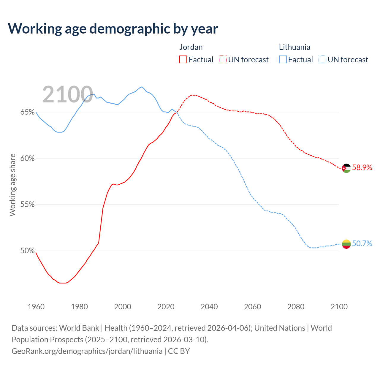 Median age Jordan vs Lithuania, 1960-2100