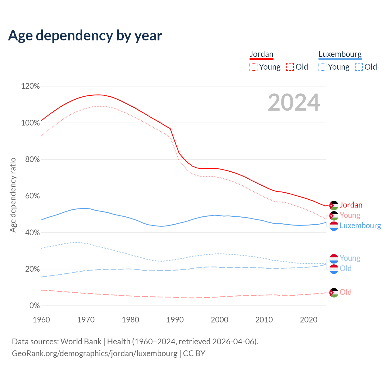 - The share of old-age demographic (65+) in Jordan is 4.52% vs 15.5% in Luxembourg.