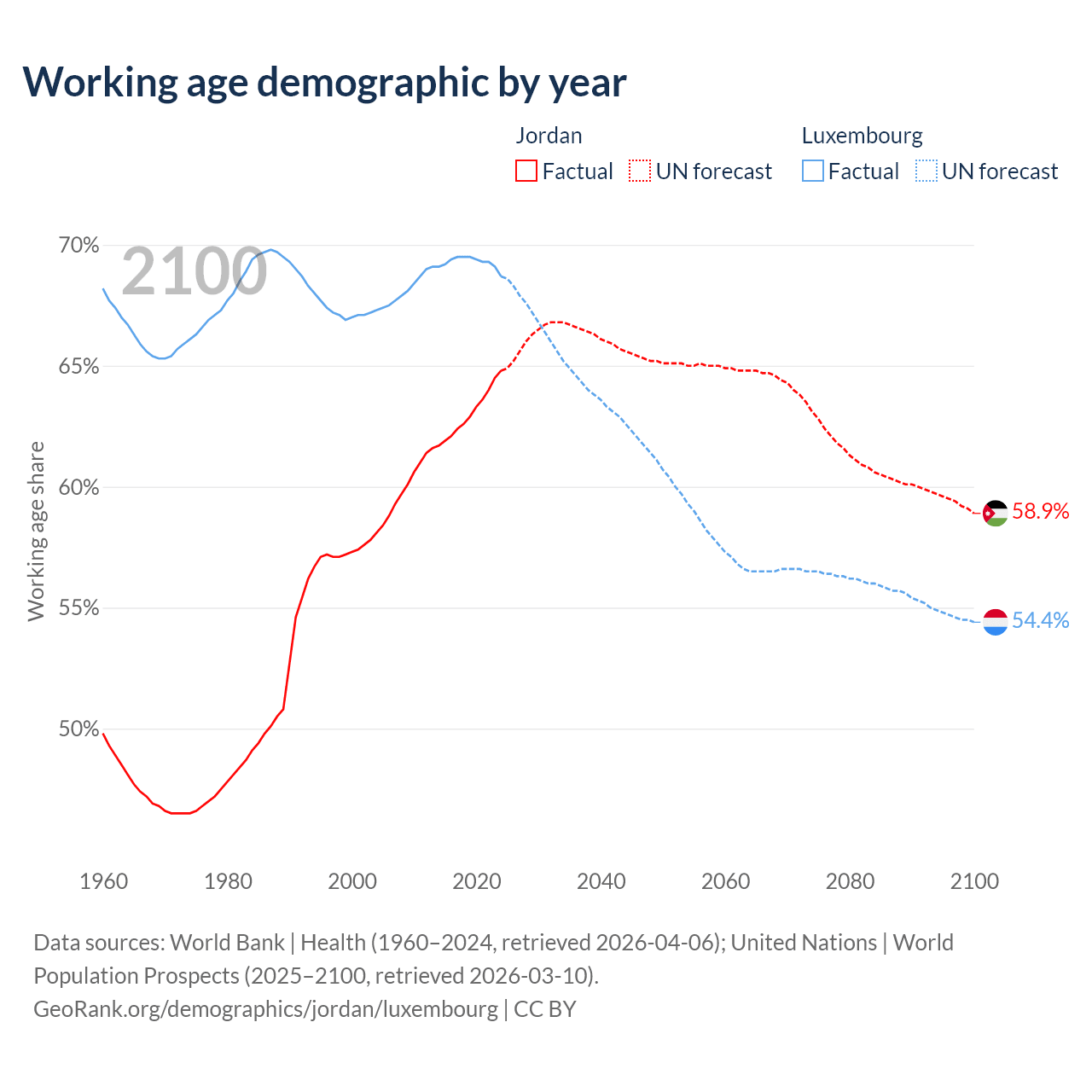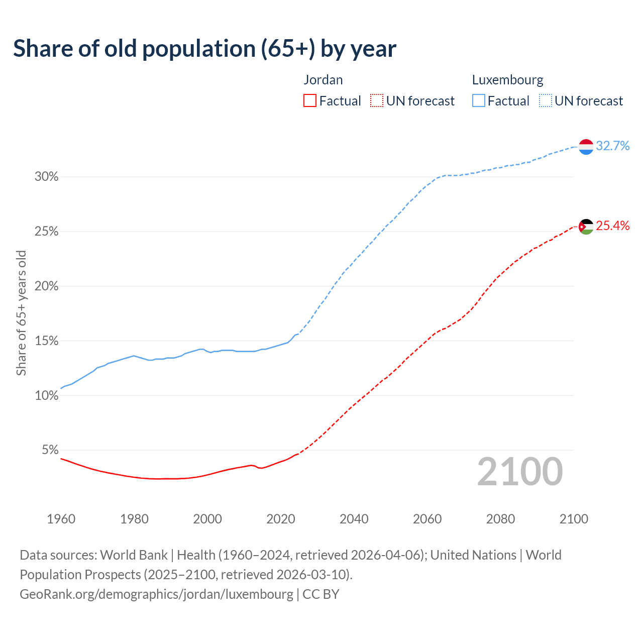 Median age Jordan vs Luxembourg, 1960-2100