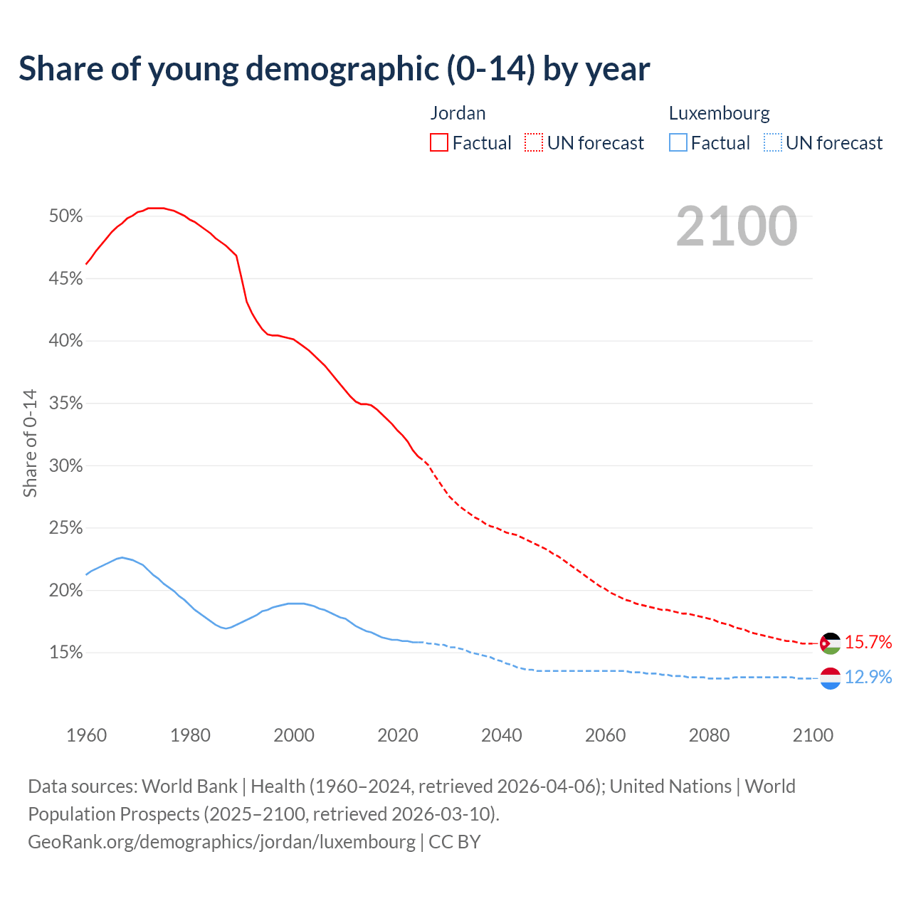 - The share of young demographic (0-15 years old) in Jordan is 30.7% vs 15.8% in Luxembourg.