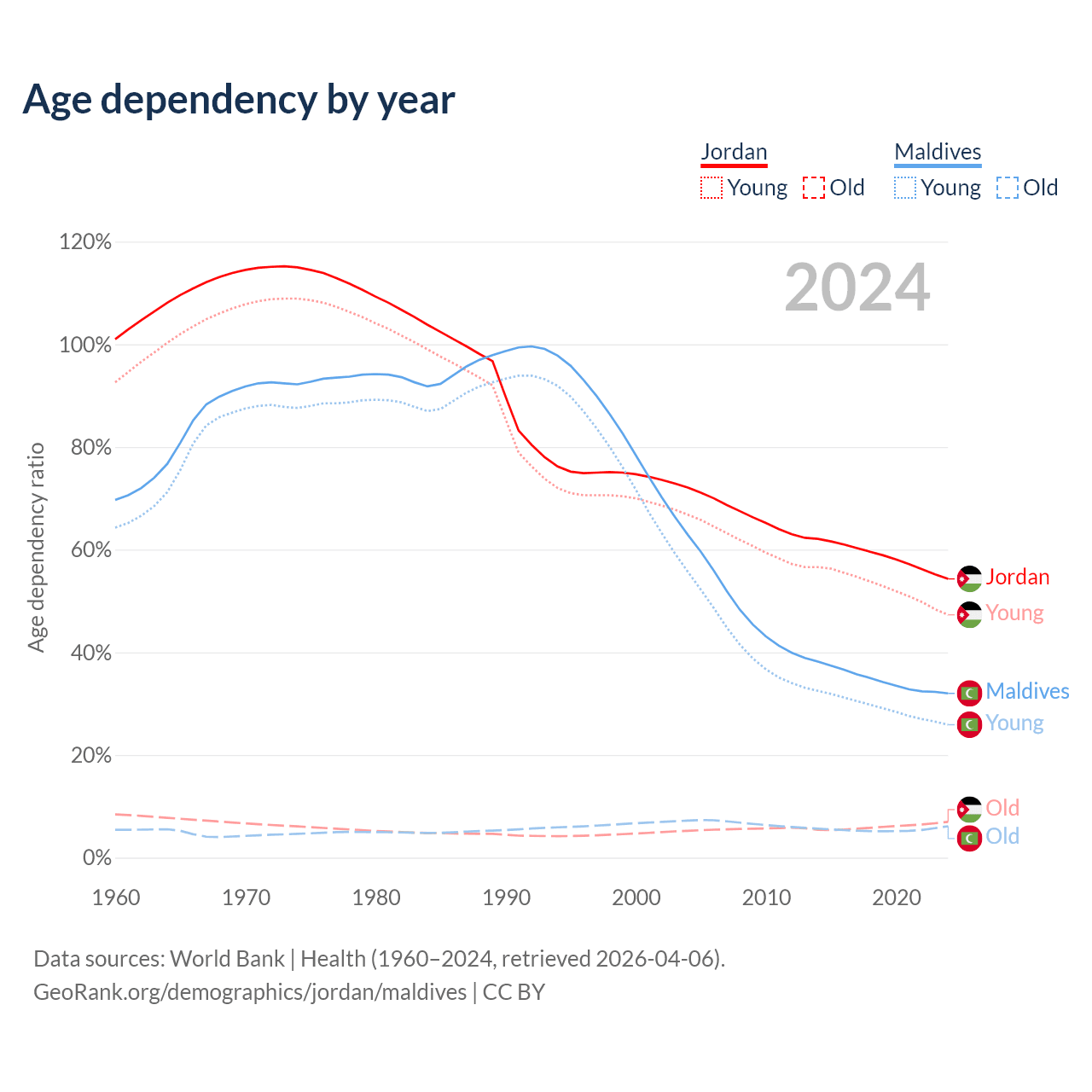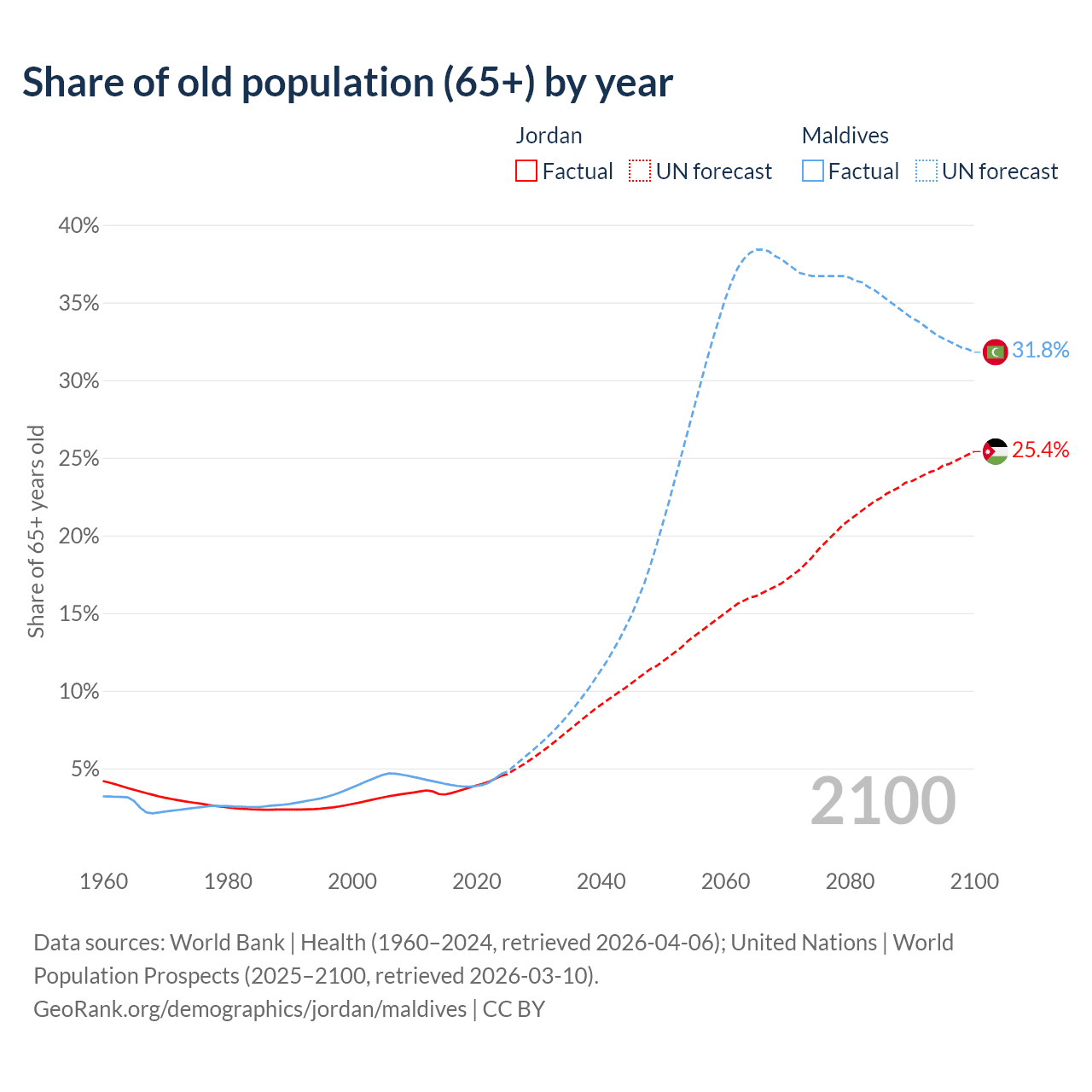 - The share of old-age demographic (65+) in Jordan is 4.52% vs 4.64% in Maldives.