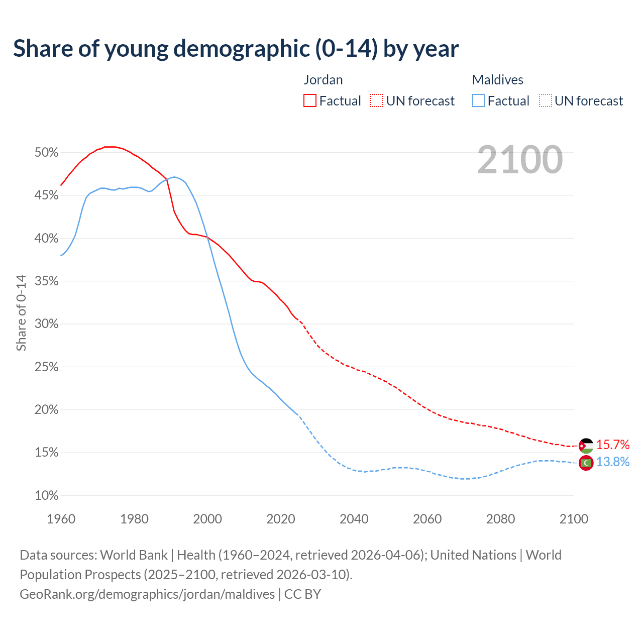 - The share of young demographic (0-15 years old) in Jordan is 30.7% vs 19.6% in Maldives.