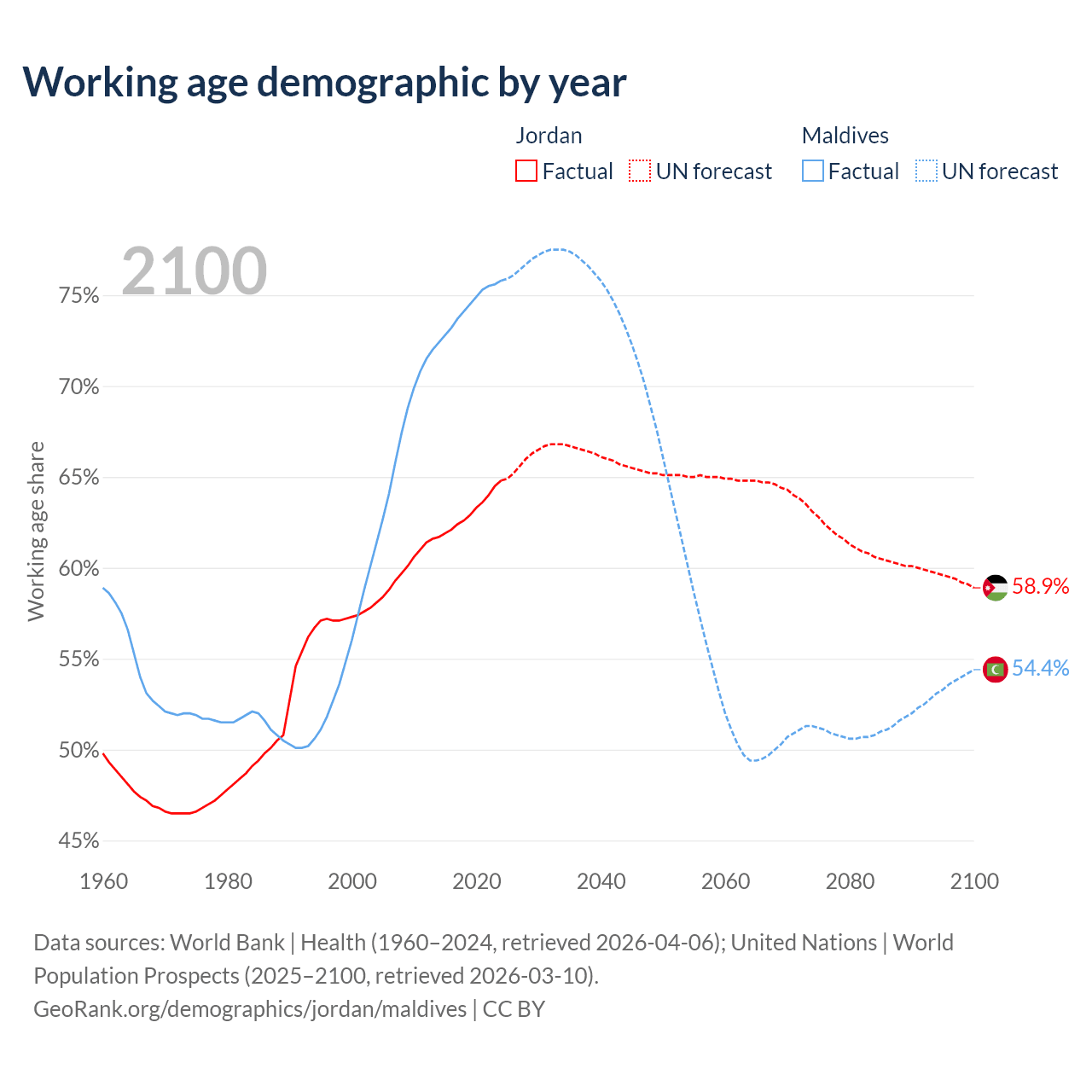 Median age Jordan vs Maldives, 1960-2100