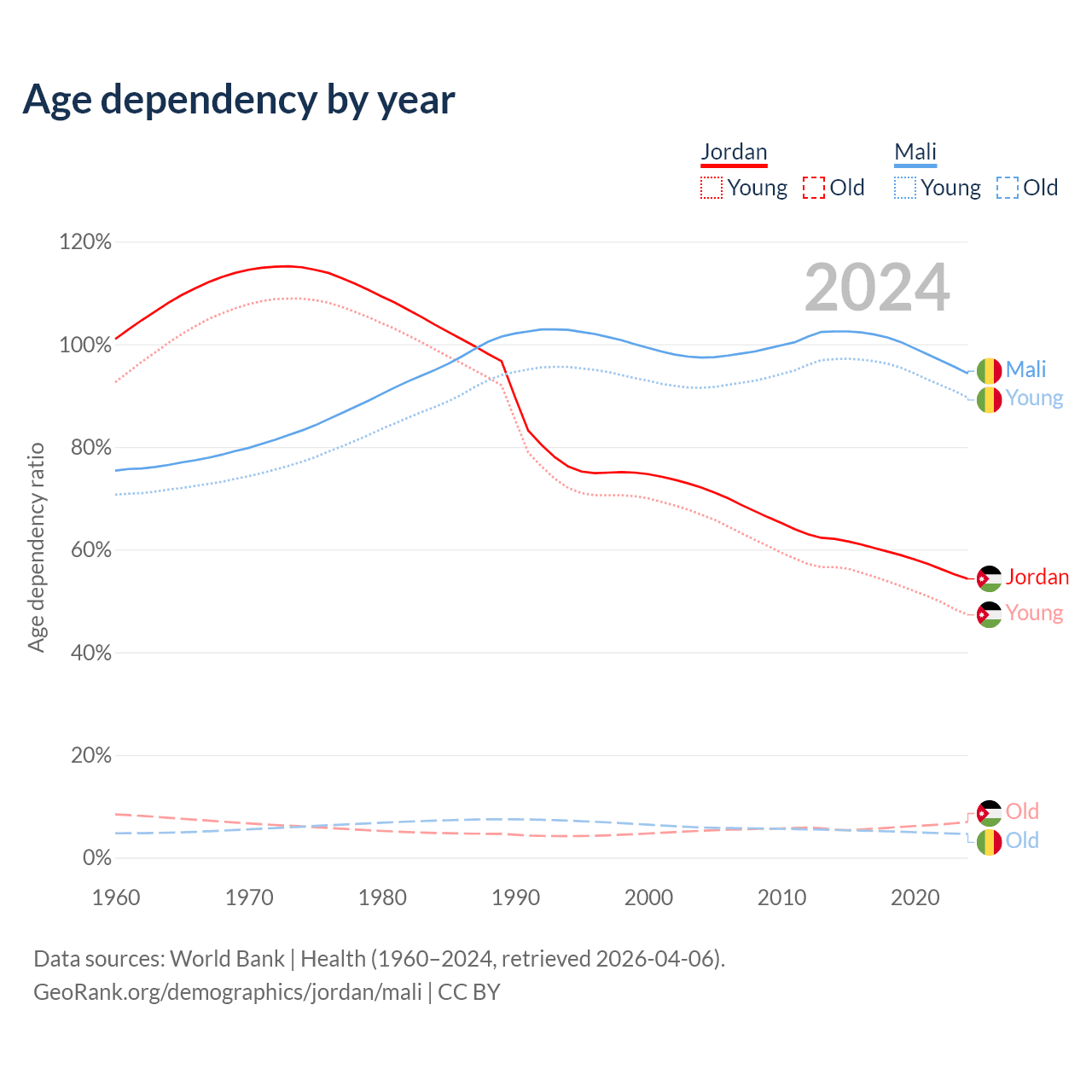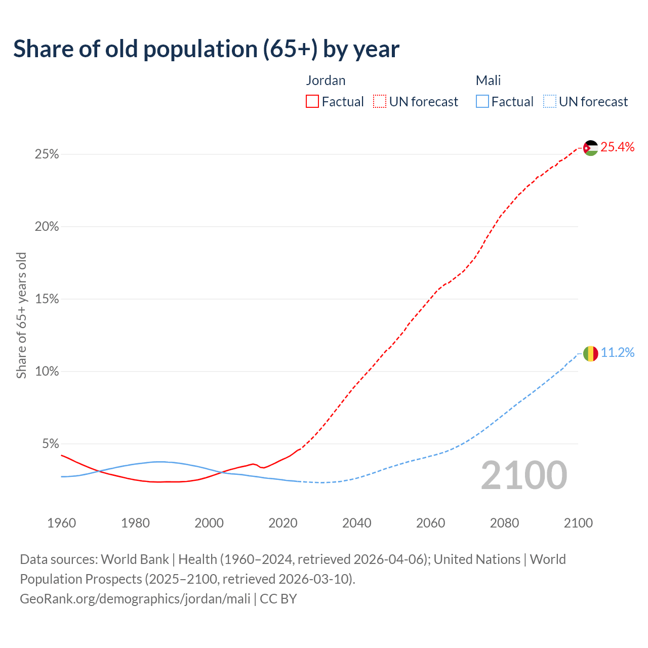 - The share of old-age demographic (65+) in Jordan is 4.52% vs 2.38% in Mali.