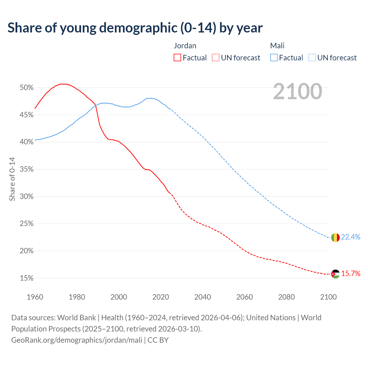 - The share of young demographic (0-15 years old) in Jordan is 30.7% vs 46.1% in Mali.