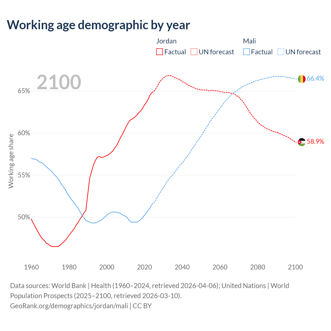 Median age Jordan vs Mali, 1960-2100